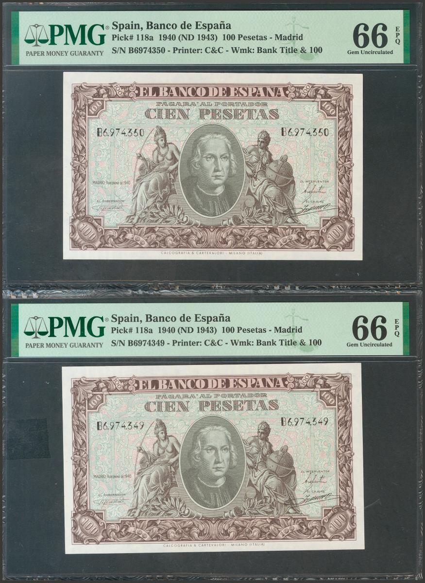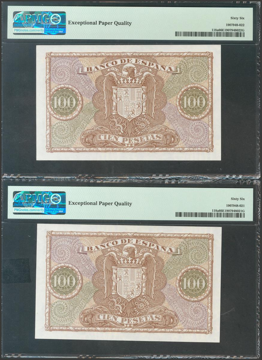 100 Pesetas. 9 de Enero de 1940. Pareja correlativa. Serie B. (Edifil 2017: 438a). Rara pareja, especialmente en esta calidad, conservando todo su apresto original. SC. Encapsulado PMG66EPQ, ambos.
