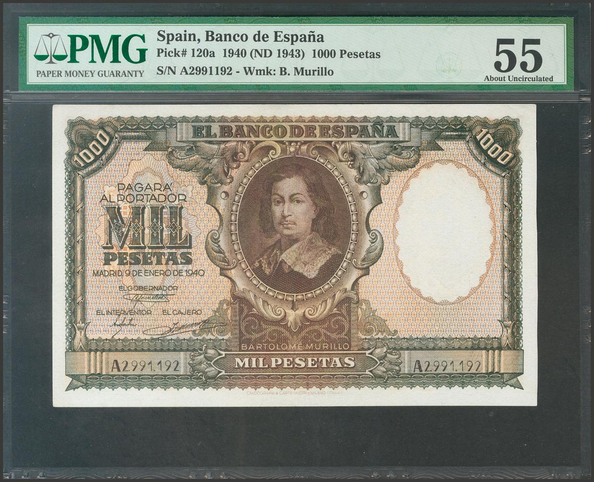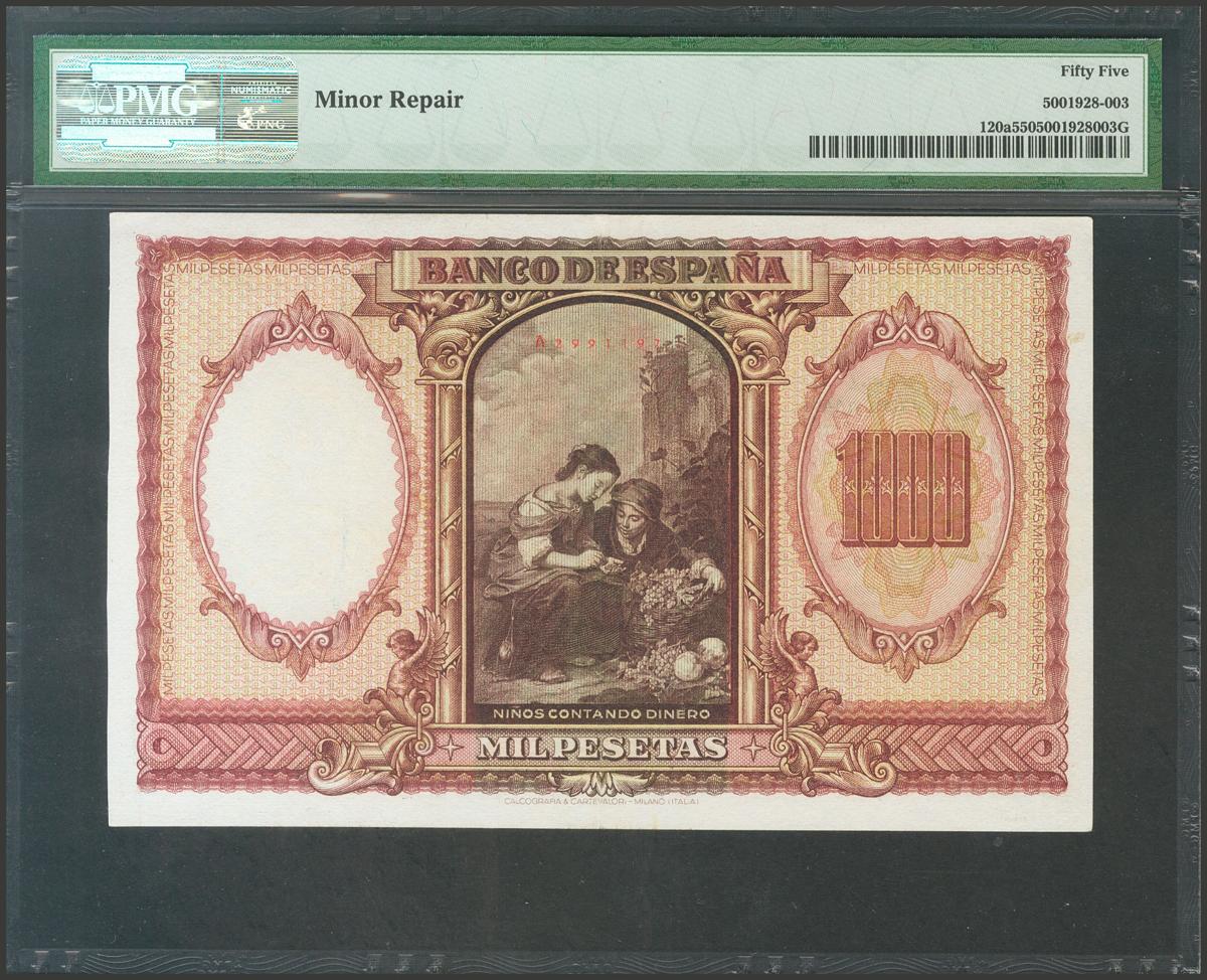 1000 Pesetas. 9 de Enero de 1940. Serie A. (Edifil 2021: 440). Raro, especialmente en esta calidad. EBC+. Encapsulado PMG55.