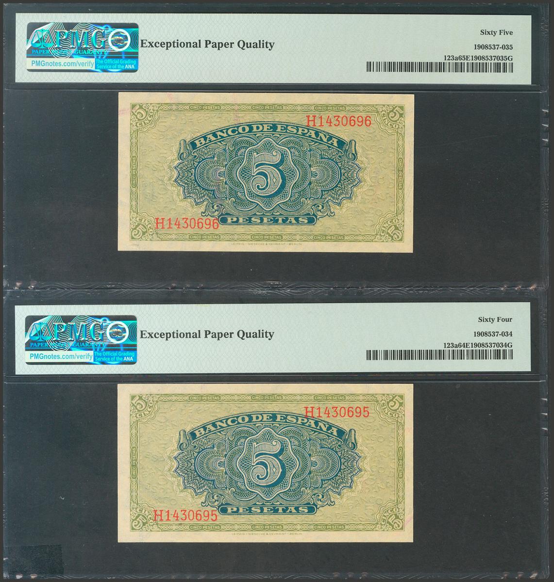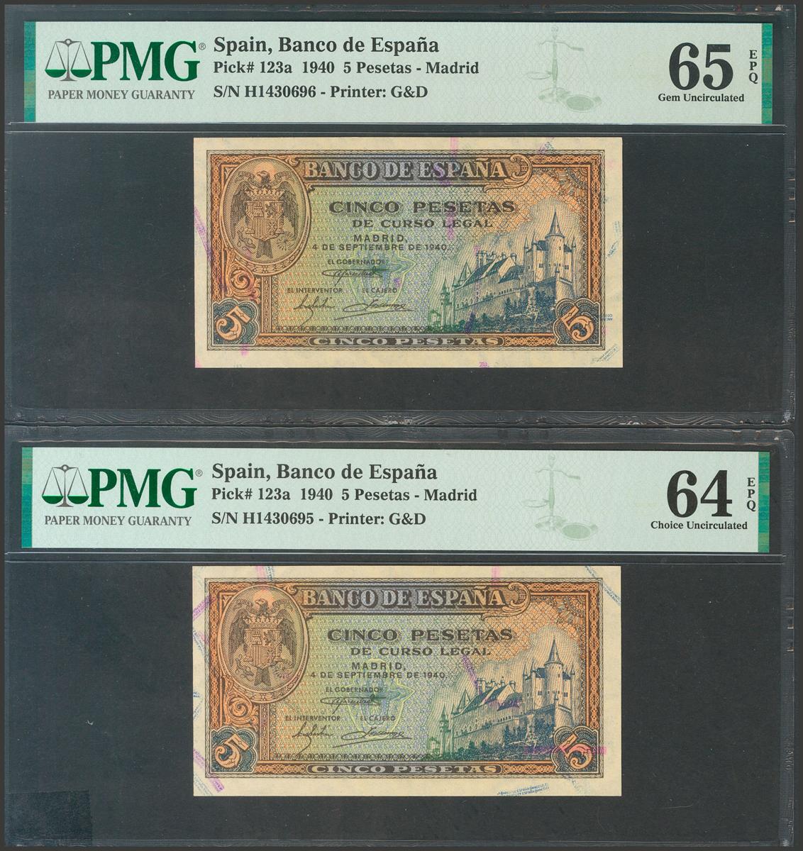 5 Pesetas. 4 de Septiembre de 1940. Pareja correlativa. Serie H. (Edifil 2017: 443a). Conserva todo el apresto original. SC. Encapsulados PMG64EPQ/65EPQ.