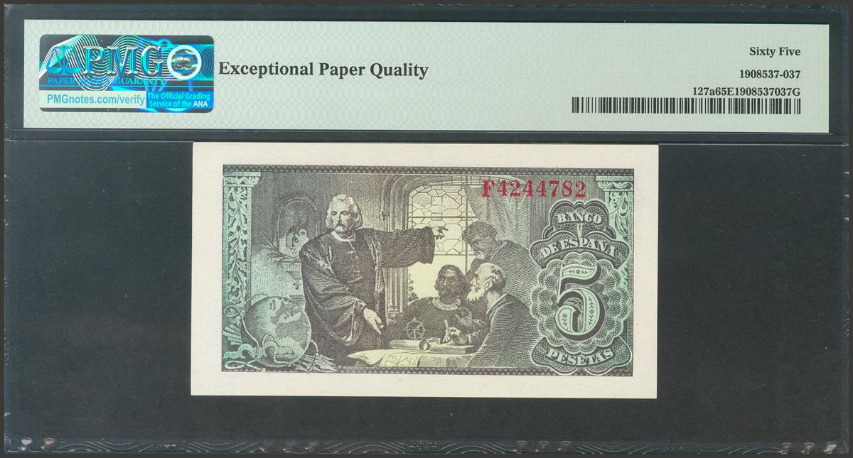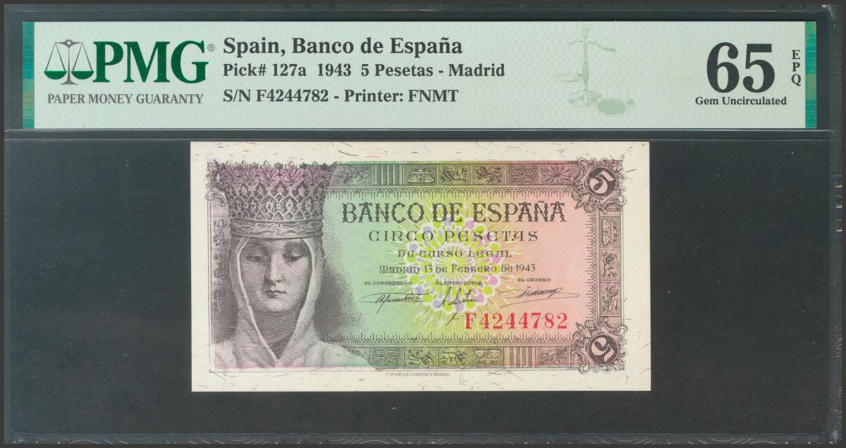 5 Pesetas. 13 de Febrero de 1943. Serie F. (Edifil 2017: 446a). Apresto original. SC. Encapsulado PMG65EPQ.