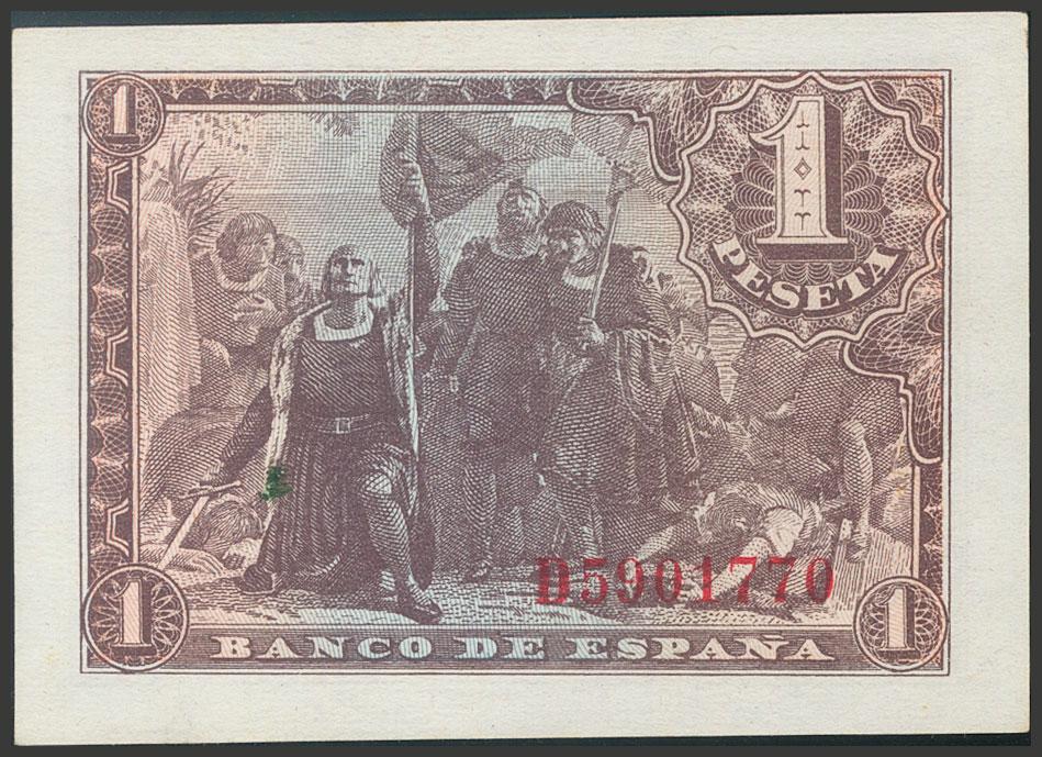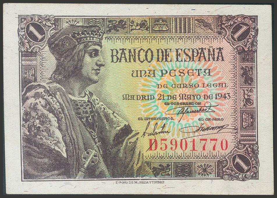 1 Peseta. 21 de Mayo de 1943. Serie D. (Edifil 2017: 447a). Apresto original y puntito de tinta verde al dorso. SC-.