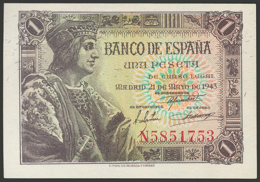 1 Peseta. 21 de Mayo de 1943. Serie N, última serie emitida. (Edifil 2017: 447a). SC-.