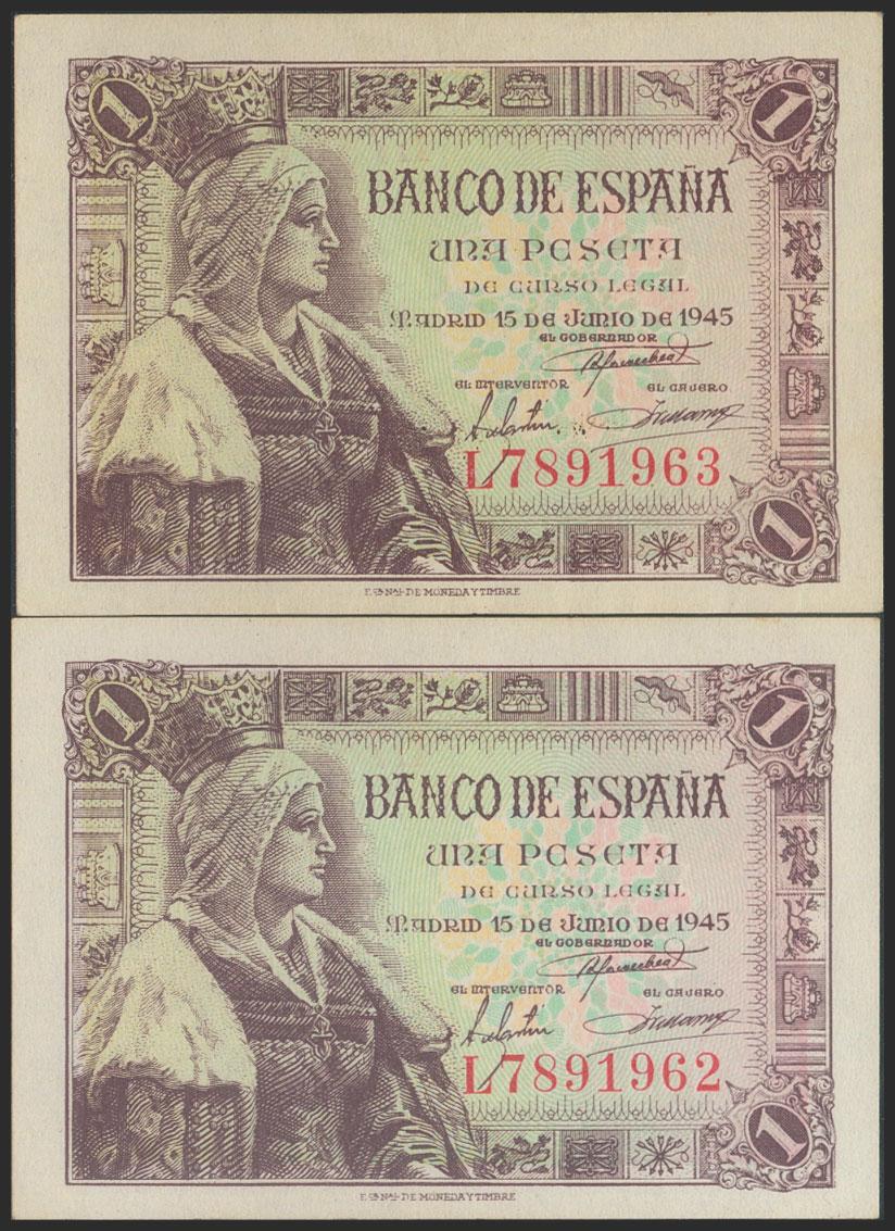 1 Peseta. 15 de Junio de 1945. Pareja correlativa. Serie L. (Edifil 2017: 448a). Apresto original. EBC+.