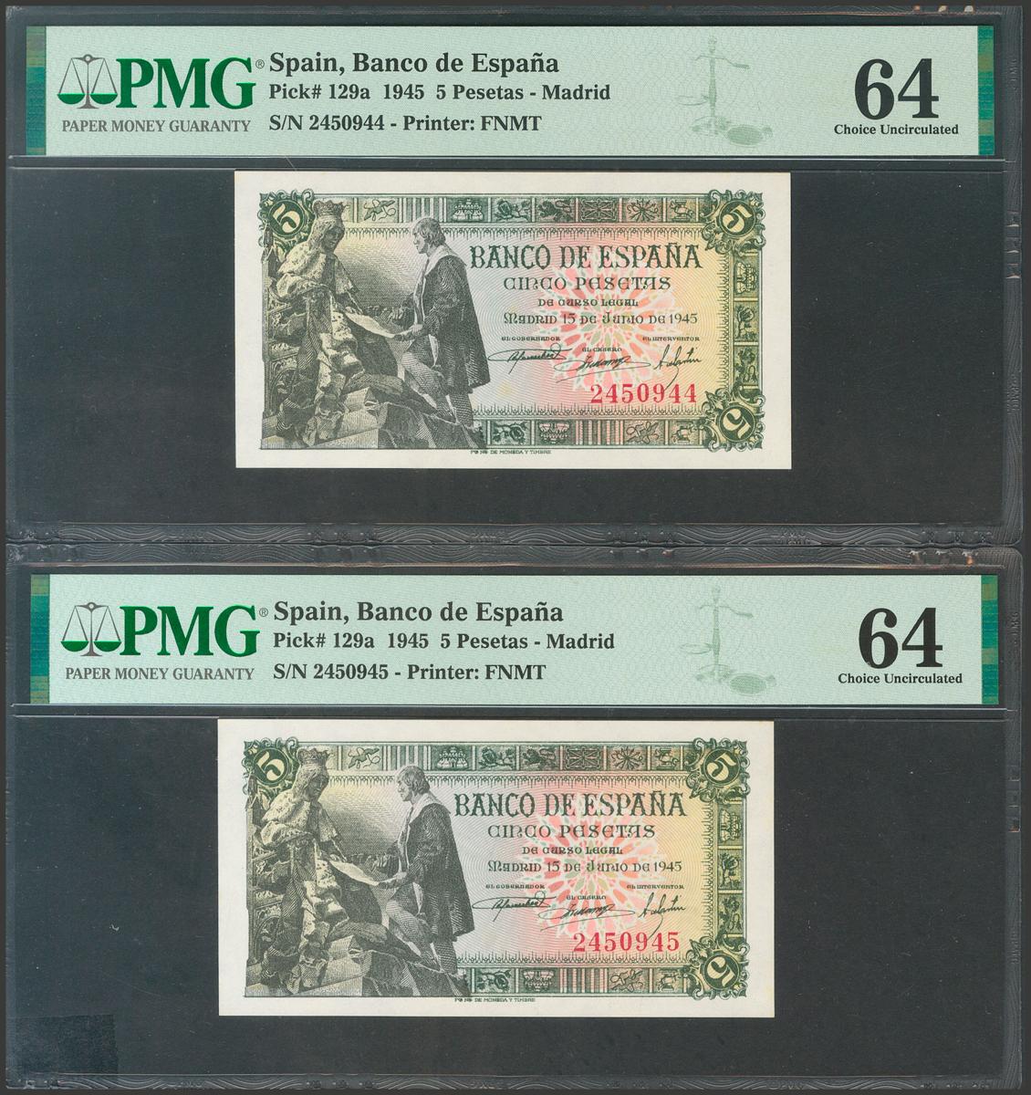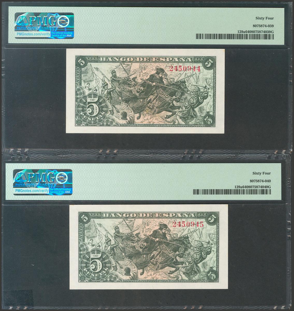 5 Pesetas. 15 de Junio de 1945. Pareja correlativa. Sin serie. (Edifil 2017: 449). Inusual. SC. Encapsulados PMG64, ambos.