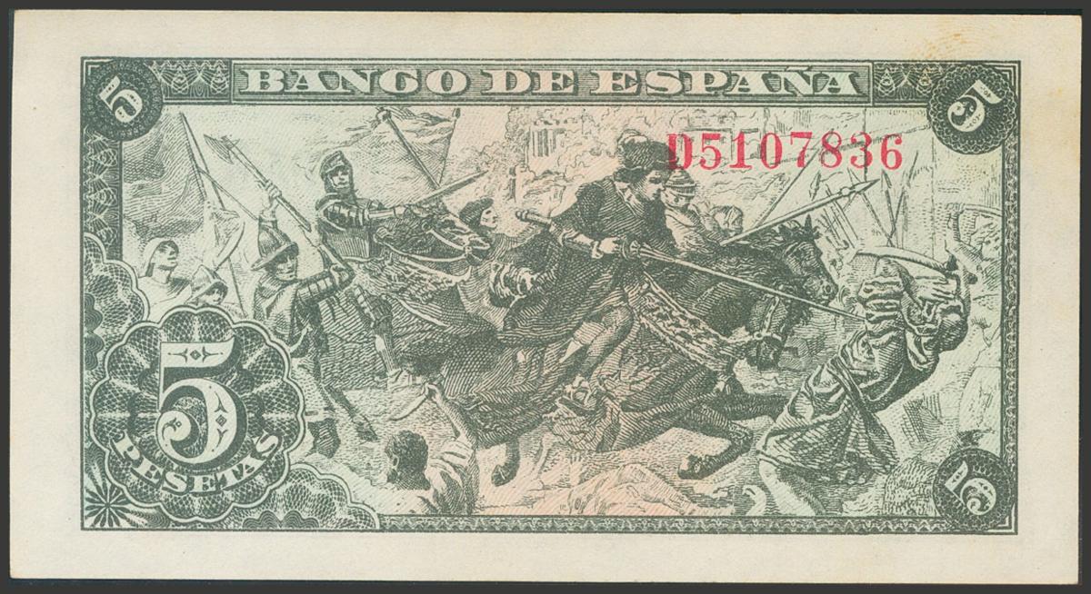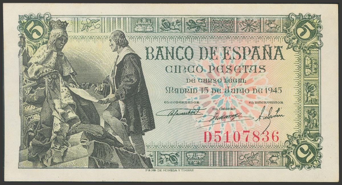 5 Pesetas. 15 de Junio de 1945. Serie D. (Edifil 2017: 449a). Apresto original. SC-.