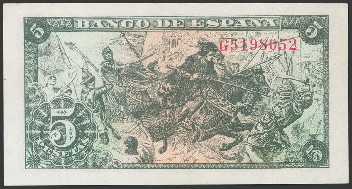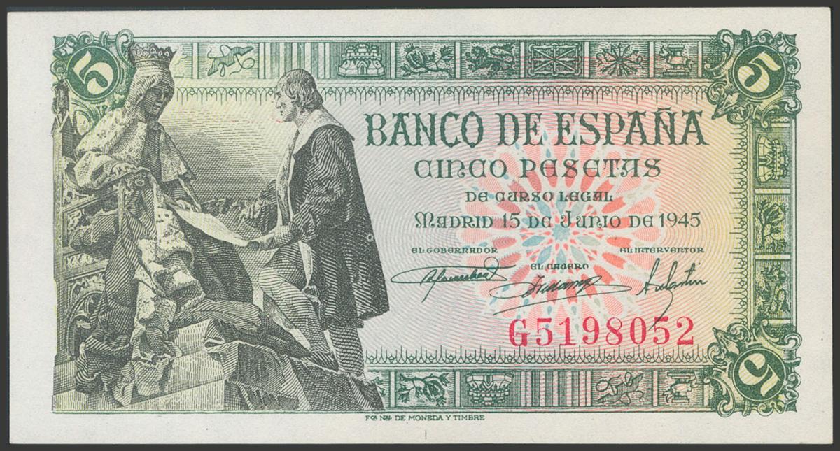 5 Pesetas. 15 de Junio de 1945. Serie G. (Edifil 2017: 449a). Apresto original. SC.