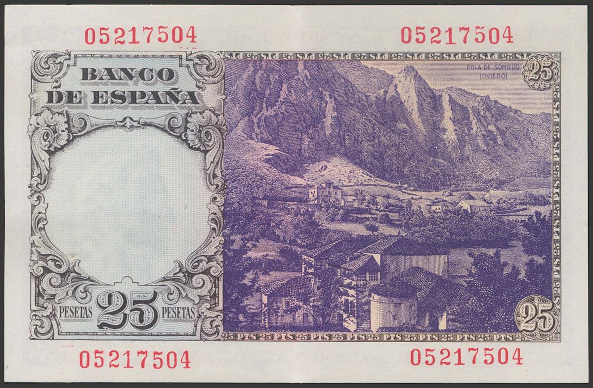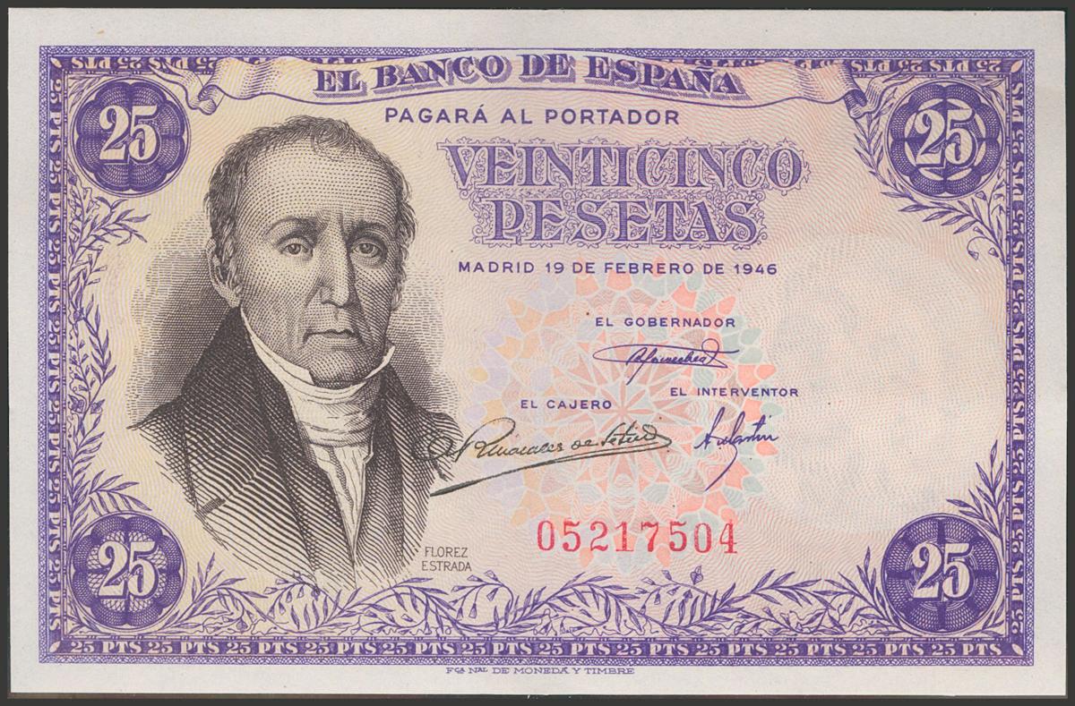 25 Pesetas. 19 de Febrero de 1949. Sin serie. (Edifil 2021: 450). Inusual, conservando gran parte de su apresto original. EBC.