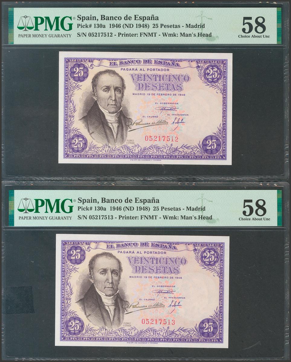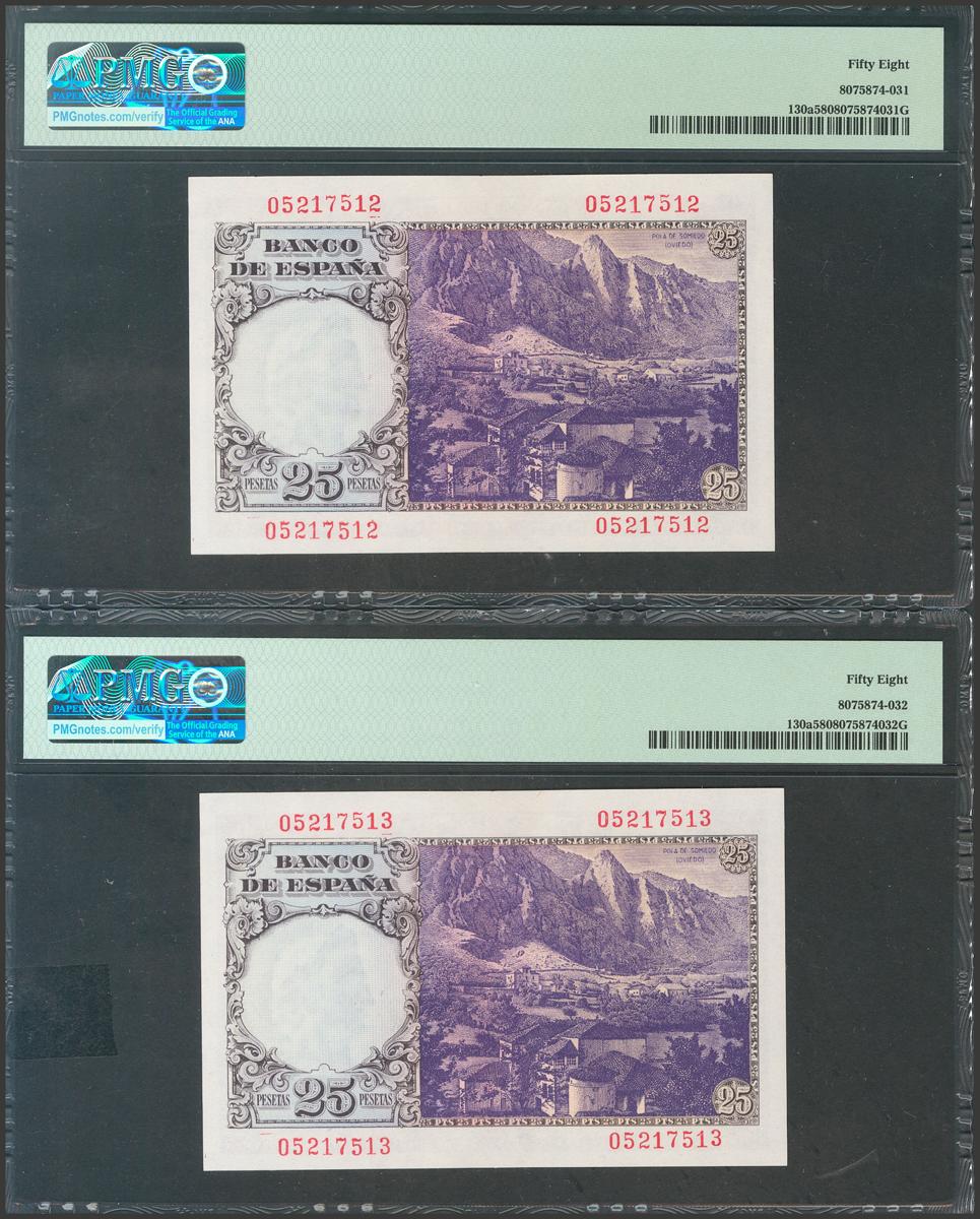 25 Pesetas. 19 de Febrero de 1946. Pareja correlativa. Sin serie. (Edifil 2017: 450). Rara pareja sin serie. EBC+. Encapsulados PMG58, ambos.