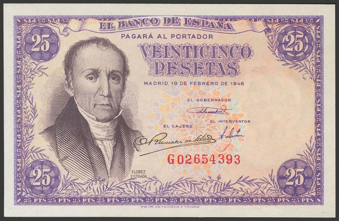 25 Pesetas. 19 de Febrero de 1946. Serie G. (Edifil 2017: 450a). Apresto original. SC.
