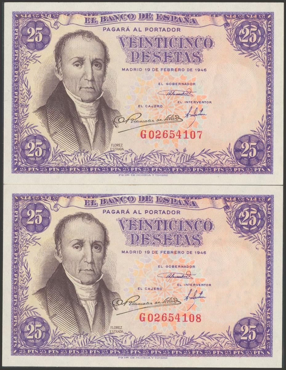 25 Pesetas. 19 de Febrero de 1946. Pareja correlativa. Serie G. (Edifil 2017: 450a). Apresto original. SC.