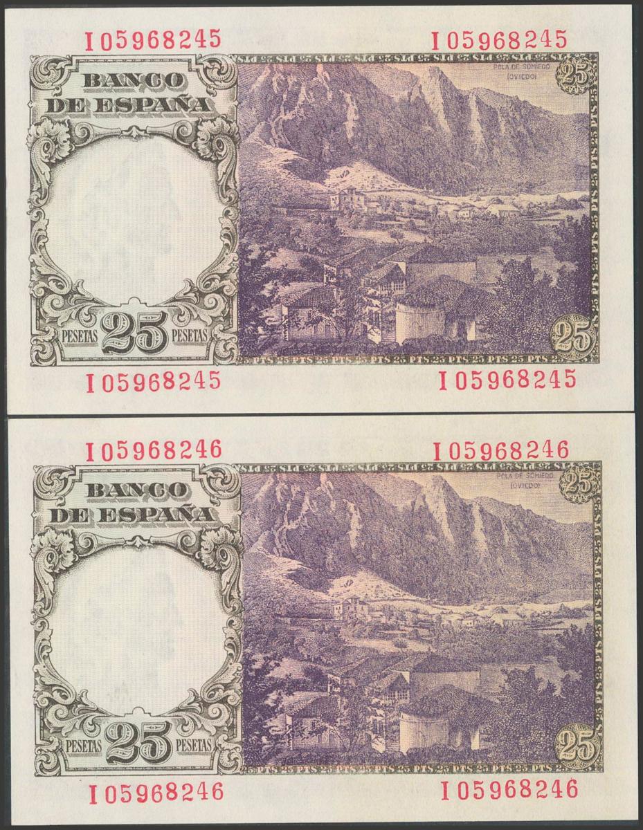 25 Pesetas. 19 de Febrero de 1946. Pareja correlativa. Serie I. (Edifil 2017: 450a). Apresto original. SC-.