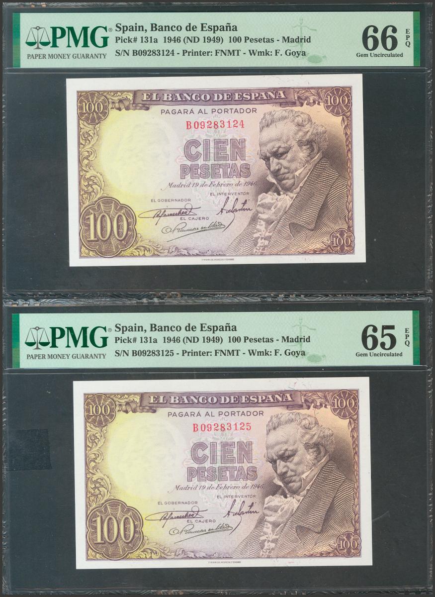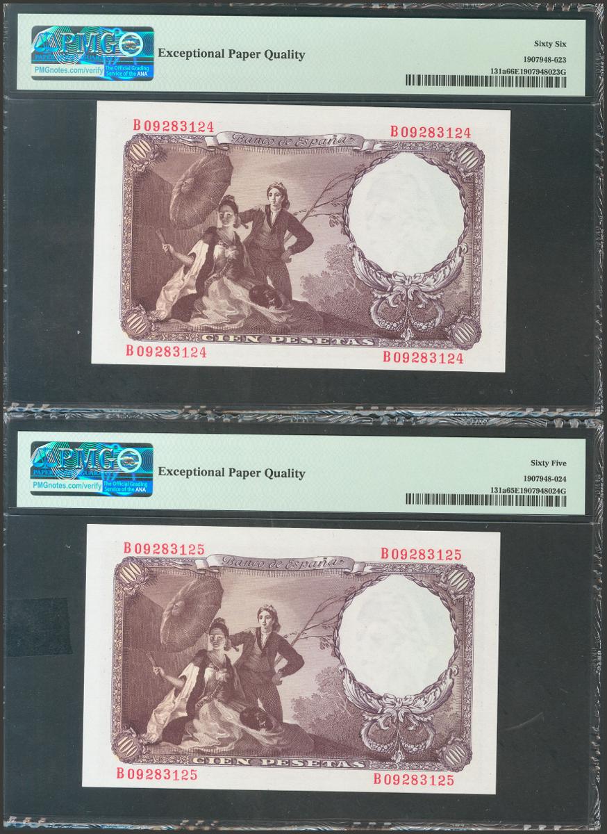 100 Pesetas. 19 de Febrero de 1946. Pareja correlativa. Serie B. (Edifil 2017: 451b). Conserva todo su apresto original. SC. Encapsulados PMG65EPQ y 66EPQ, respectivamente.