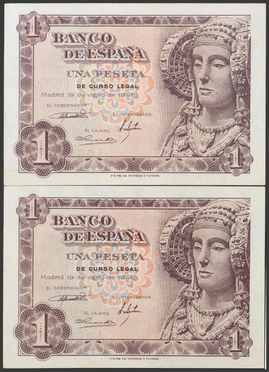 1 Peseta. 19 de Junio de 1948. Pareja correlativa. Serie A. (Edifil 2017: 457a). Apresto original. SC.
