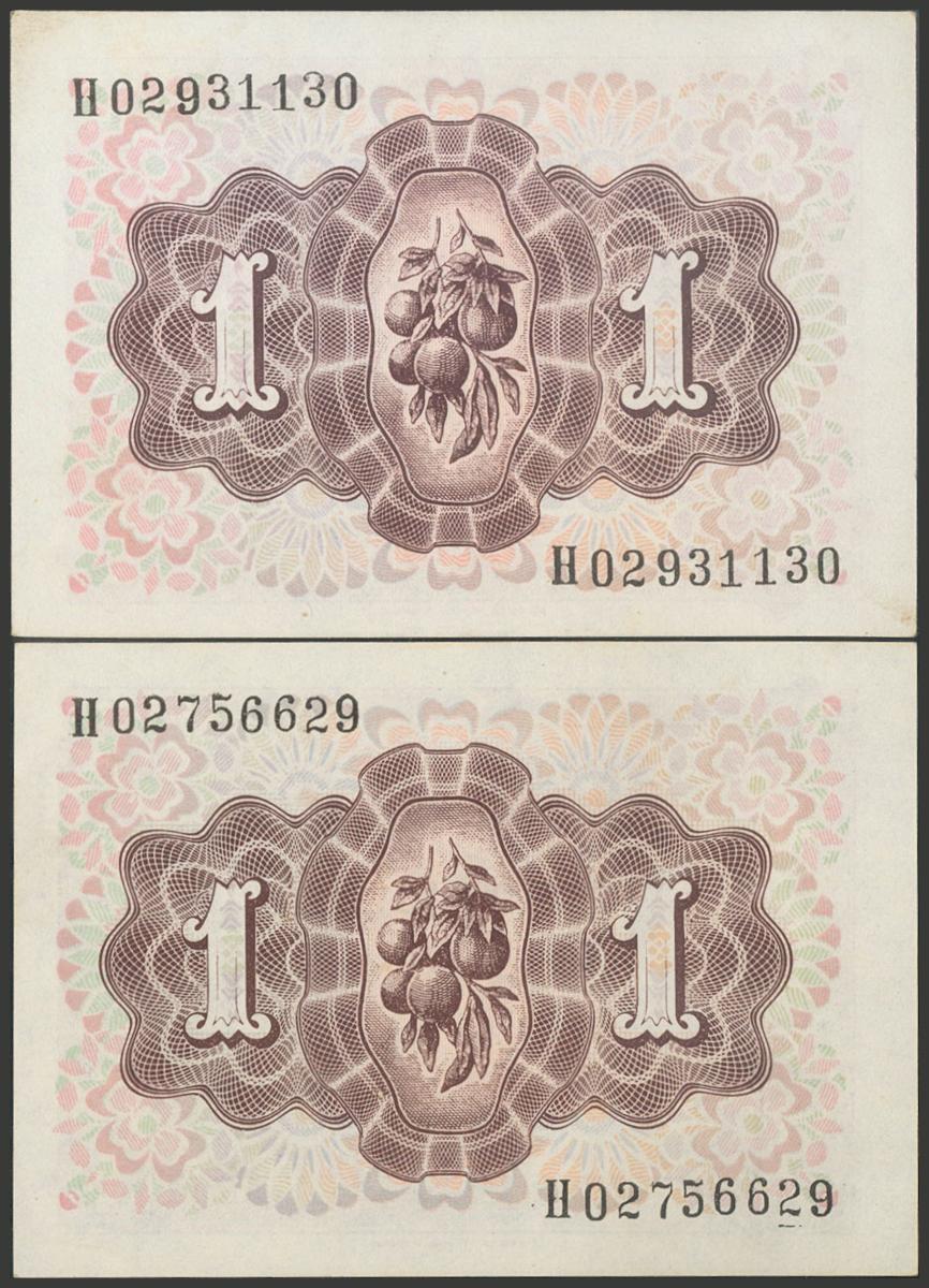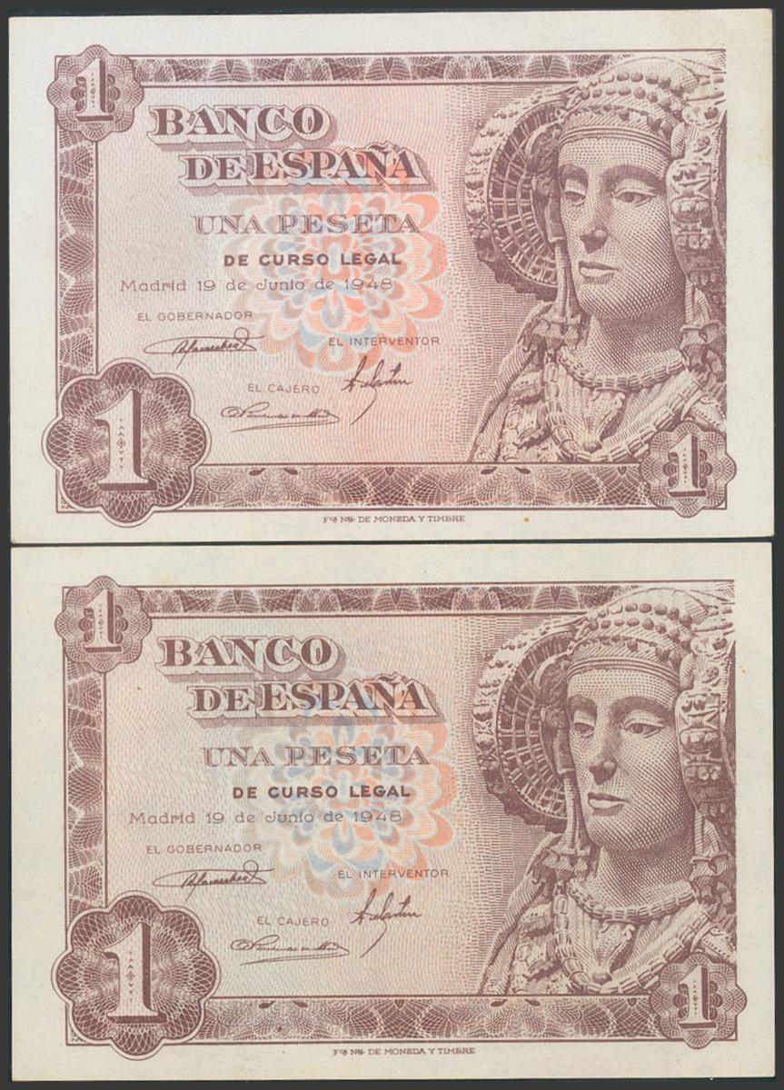 Conjunto de 2 billetes de 1 Peseta emitidos el 19 de Junio de 1948, con la serie H (Edifil 2017: 457a), con apresto original. SC-.