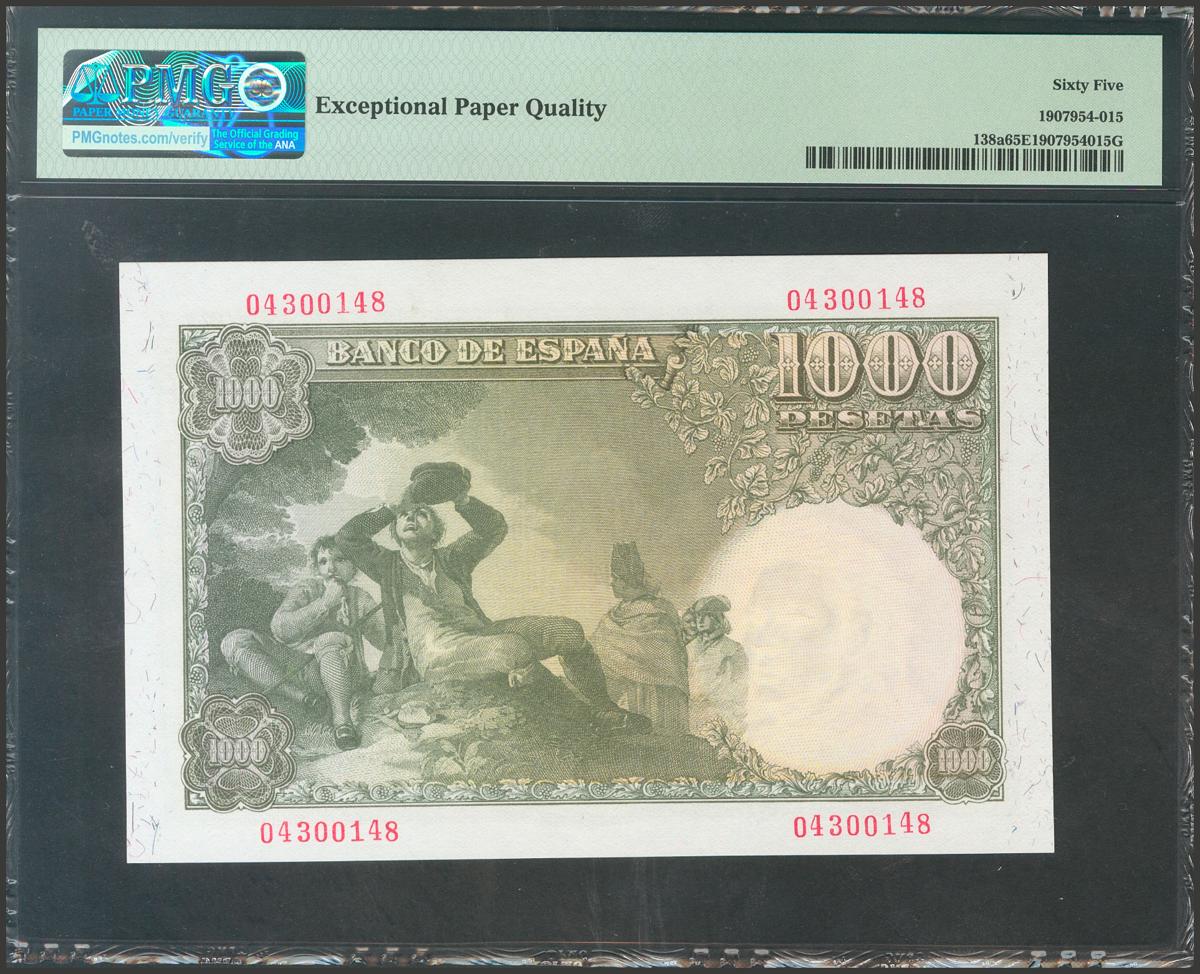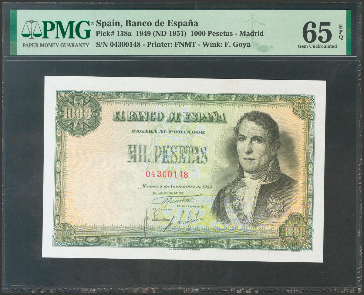 1000 Pesetas. 4 de Noviembre de 1949. Sin serie. (Edifil 2017: 458). Rarísimo en esta excecpional calidad, conserva todo su apresto original. Encapsulado PMG65EPQ.