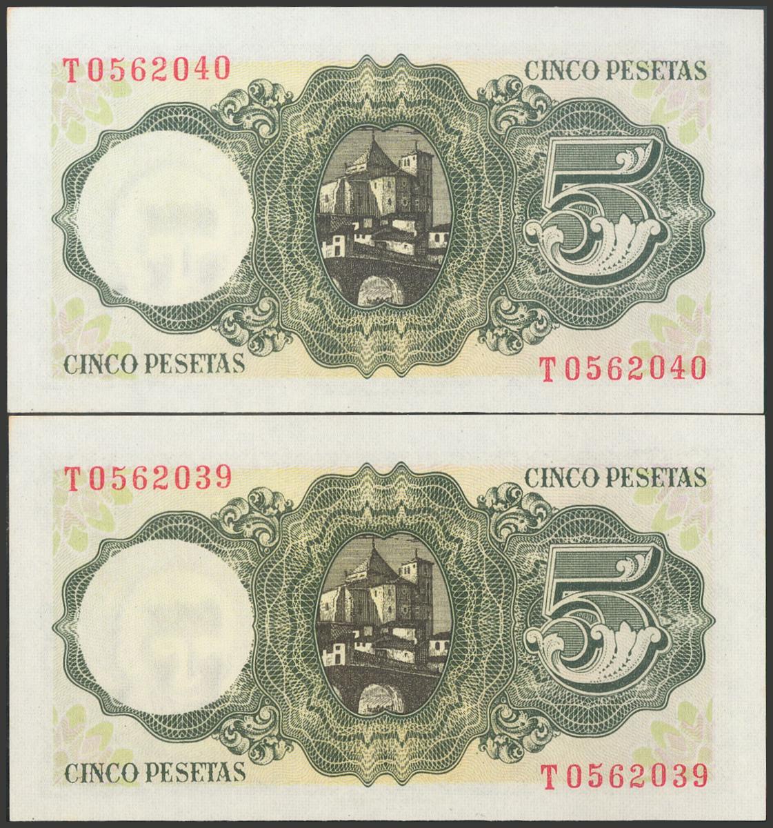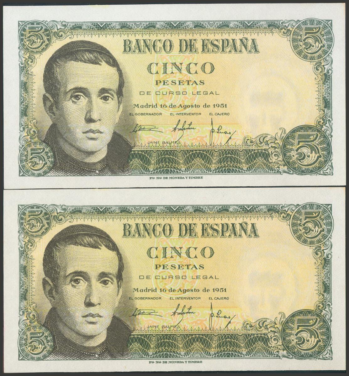5 Pesetas. 16 de Agosto de 1951. Pareja correlativa. Serie T. (Edifil 2017: 459a). Apresto original. SC-.