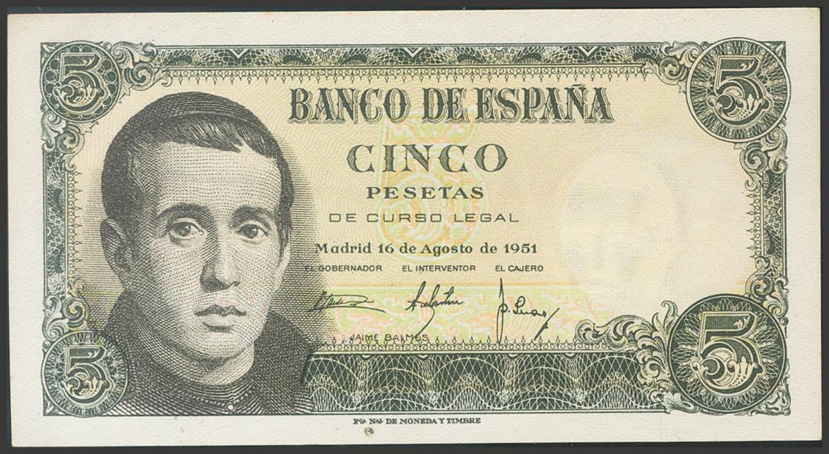 5 Pesetas. 16 de Agosto de 1951. Serie 1B. (Edifil 2017: 459a). Apresto original. EBC+.