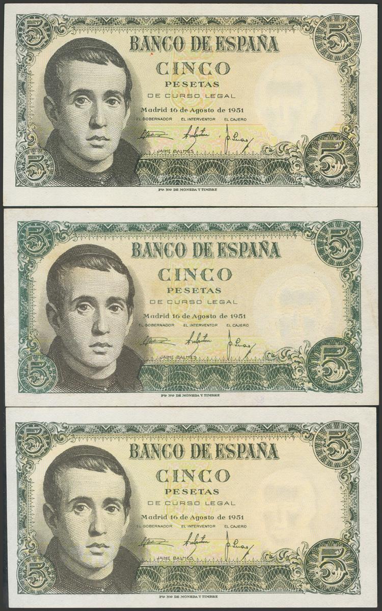 Conjunto de 3 billetes de 5 Pesetas emitidos el 16 de Agosto de 1951, con las series K, V y 1D, respectivamente (Edifil 2017: 459a), conserva el apresto original. SC/EBC+.