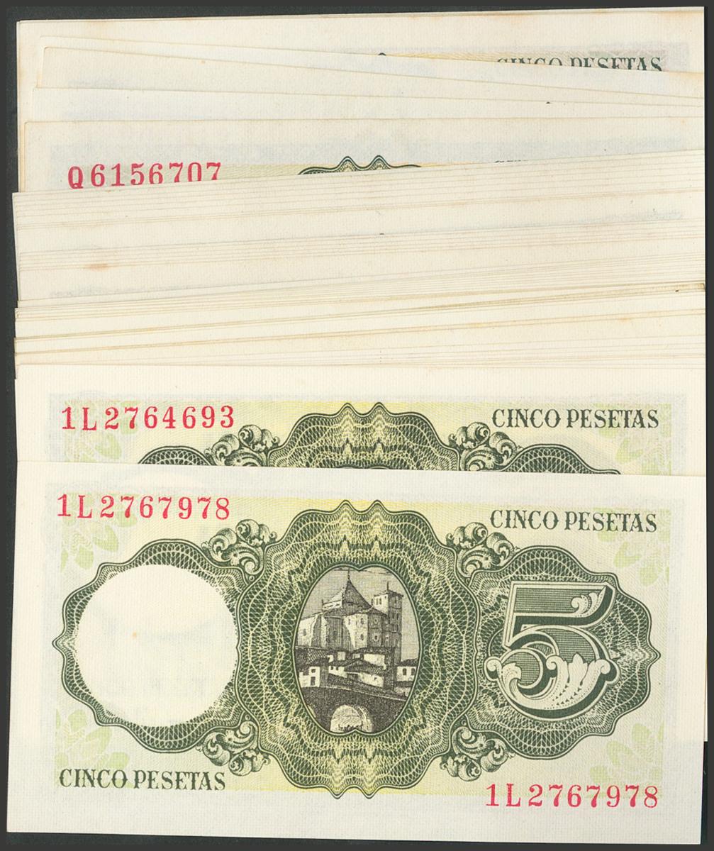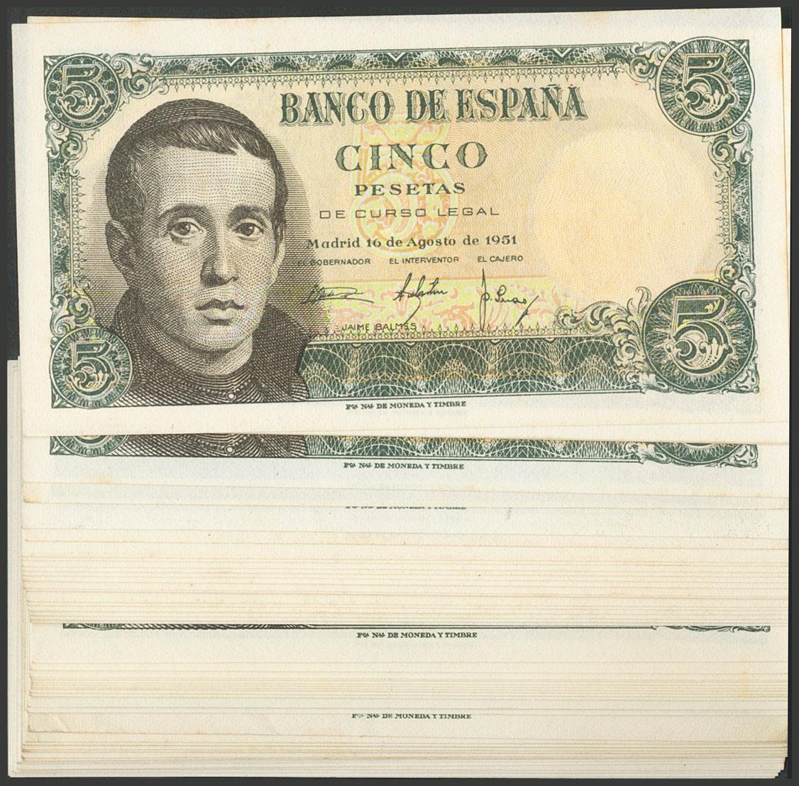 Conjunto de 51 billetes (muchos de ellos correlativos) de 5 Pesetas emitidos el 16 de Agosto de 1951, con las series D(4), H(2), Q(1), V(15), 1B(20), 1G(7) y 1L(2) (Edifil 2017: 459a). SC/SC-.