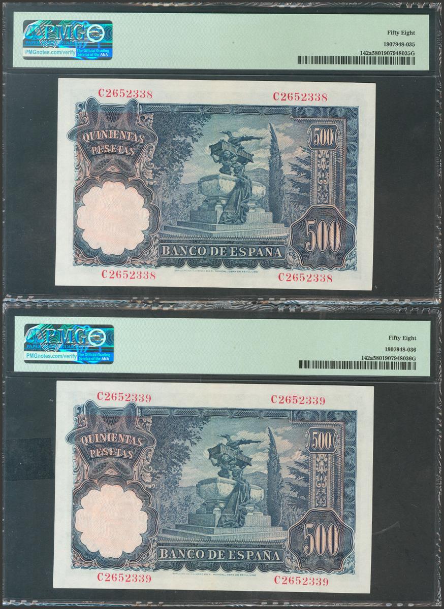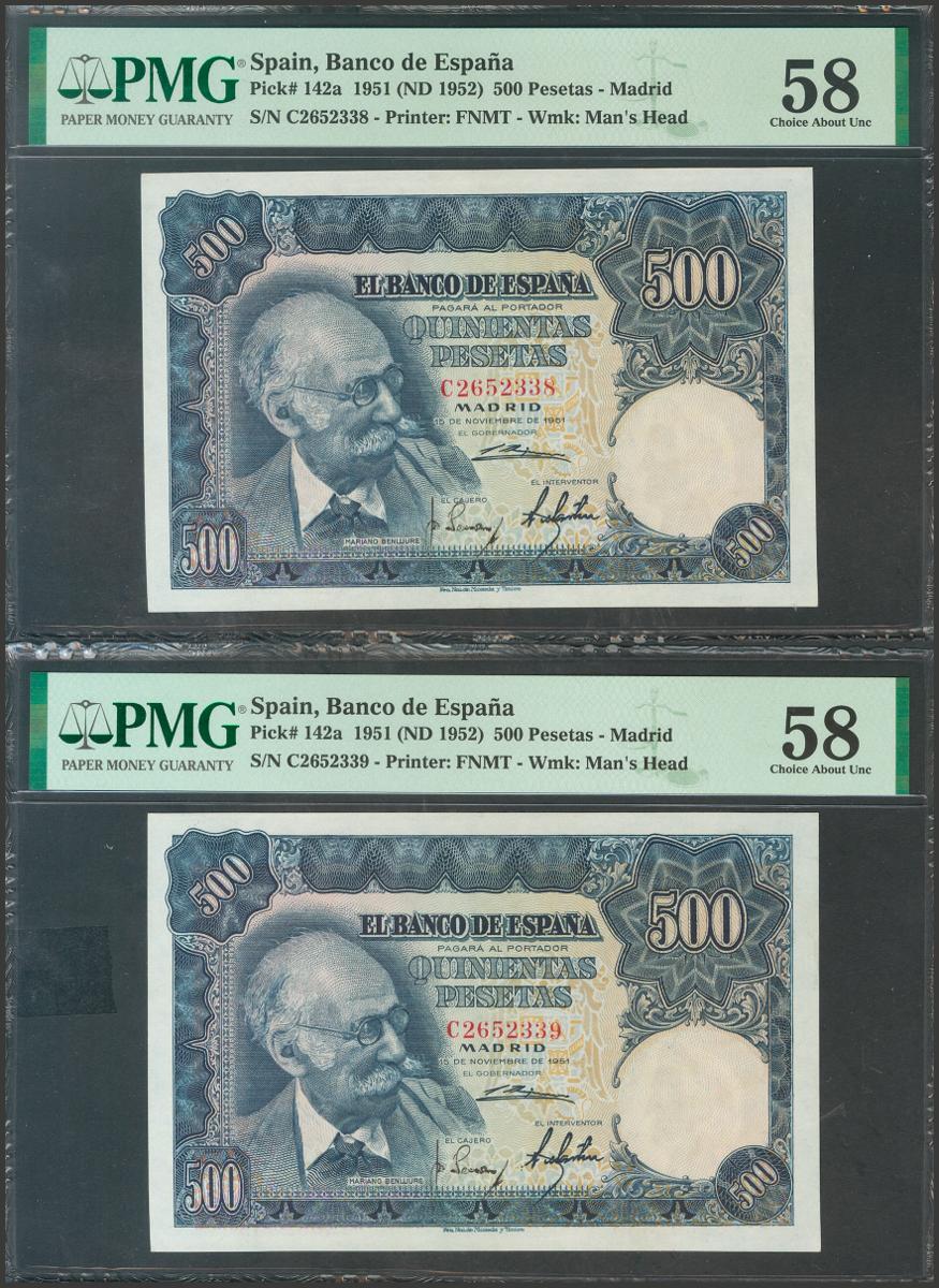 500 Pesetas. 15 de Noviembre de 1951. Pareja correlativa. Serie C, última serie emitida. (Edifil 2017: 460a). Rara. EBC+. Encapsulados PMG58, ambos.