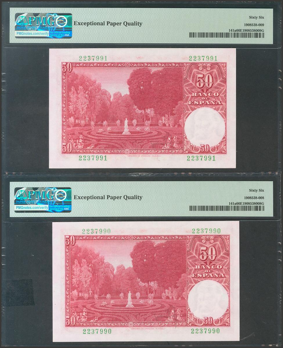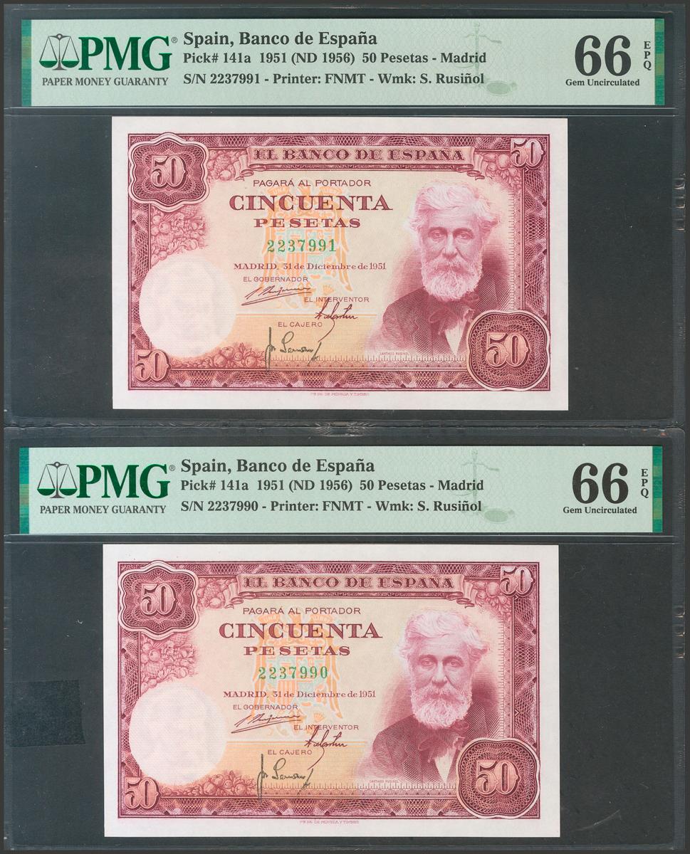 50 Pesetas. 31 de Diciembre de 1951. Pareja correlativa. Sin serie. (Edifil 2017: 462). Conserva todo su apresto original. SC. Encapsulados PMG66EPQ, ambos.