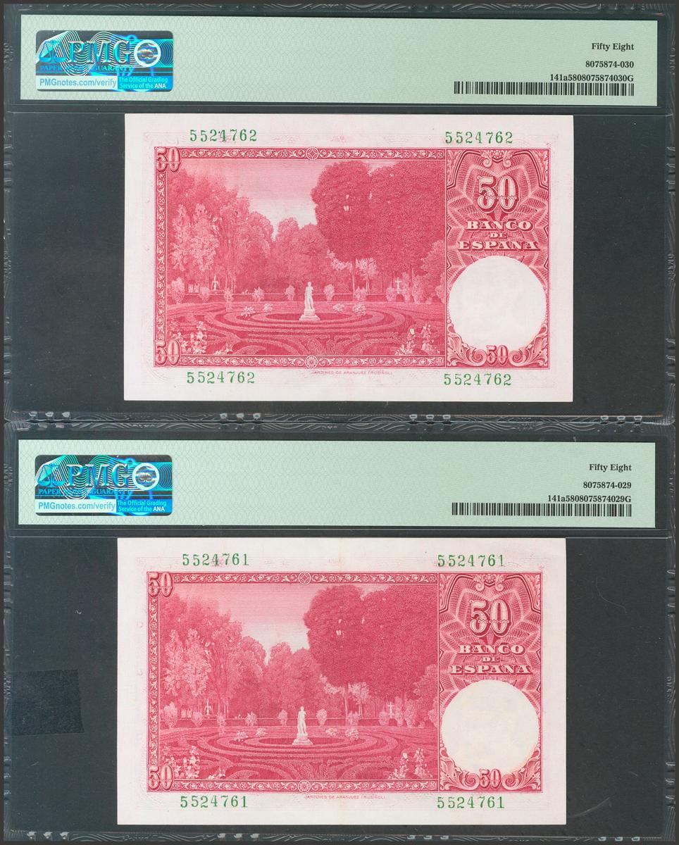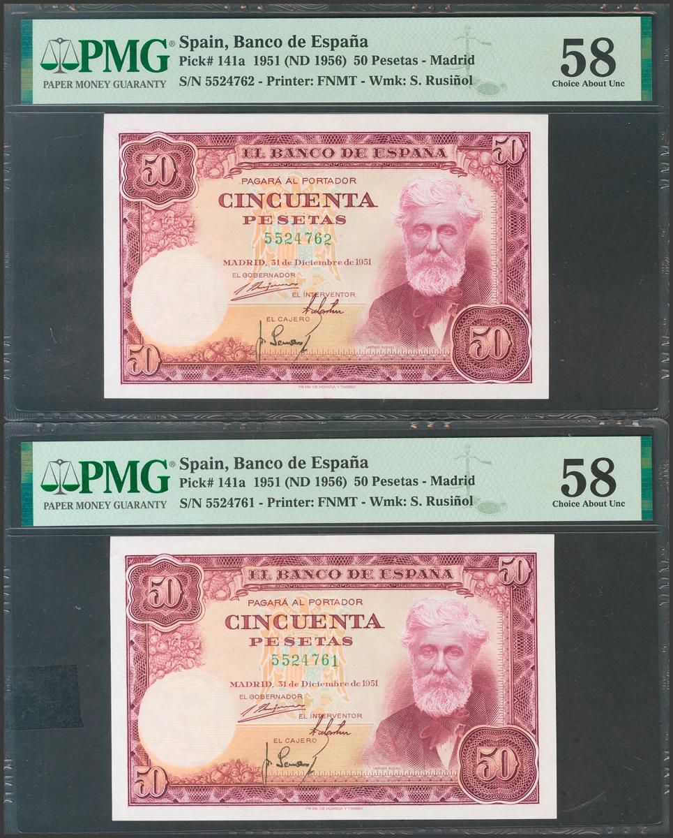50 Pesetas. 31 de Diciembre de 1951. Pareja correlativa. Sin serie. (Edifil 2017: 462). EBC+. Encapsulado PMG58, ambos.