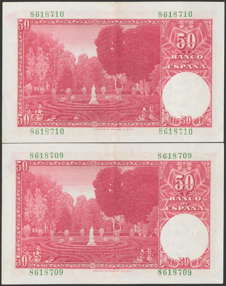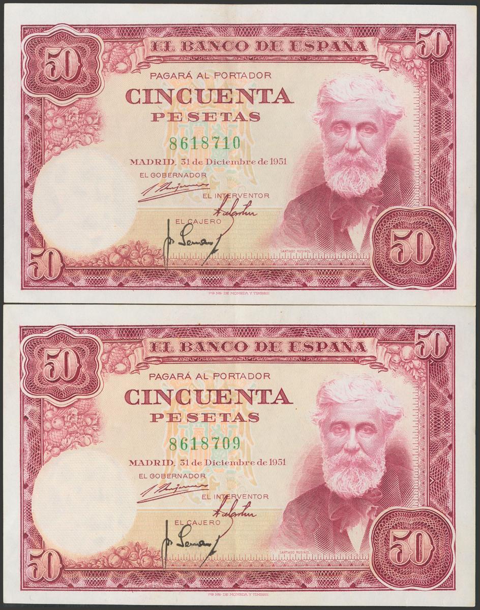 50 Pesetas. 31 de Diciembre de 1951. Pareja correlativa. Sin serie. (Edifil 2017: 462). Conserva gran parte de su apresto original. EBC+.El importe de la liquidación de este lote irá destinado a Manos Unidas.