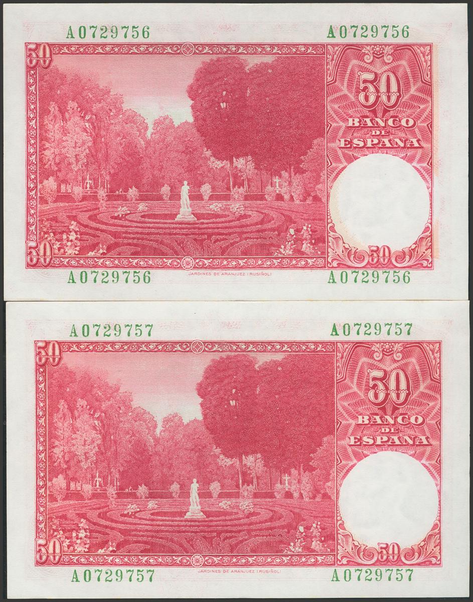50 Pesetas. 31 de Diciembre de 1951. Pareja correlativa. Serie A. (Edifil 2017: 462a). Conserva parte del apresto original, ondulación muy difícil de apreciar, que obviamente no rompe fibra. EBC+.