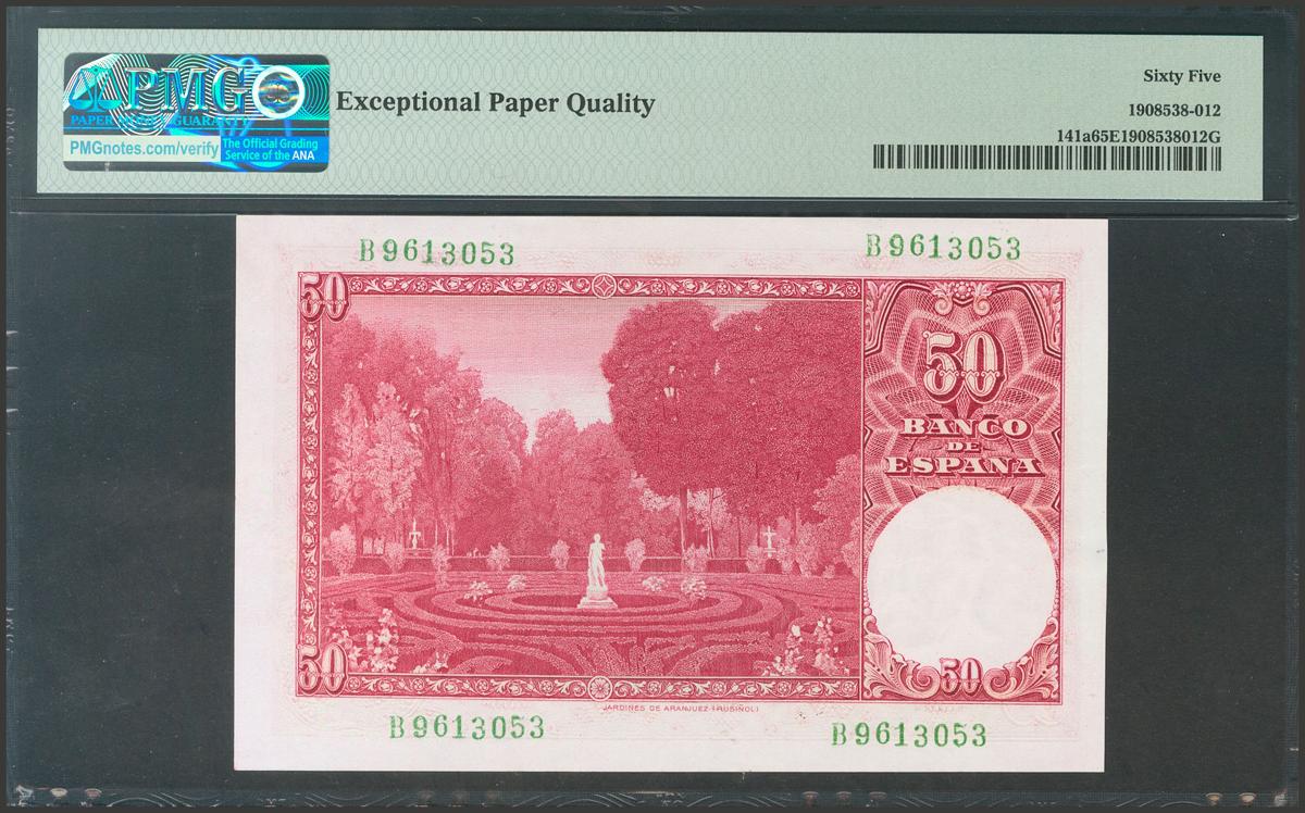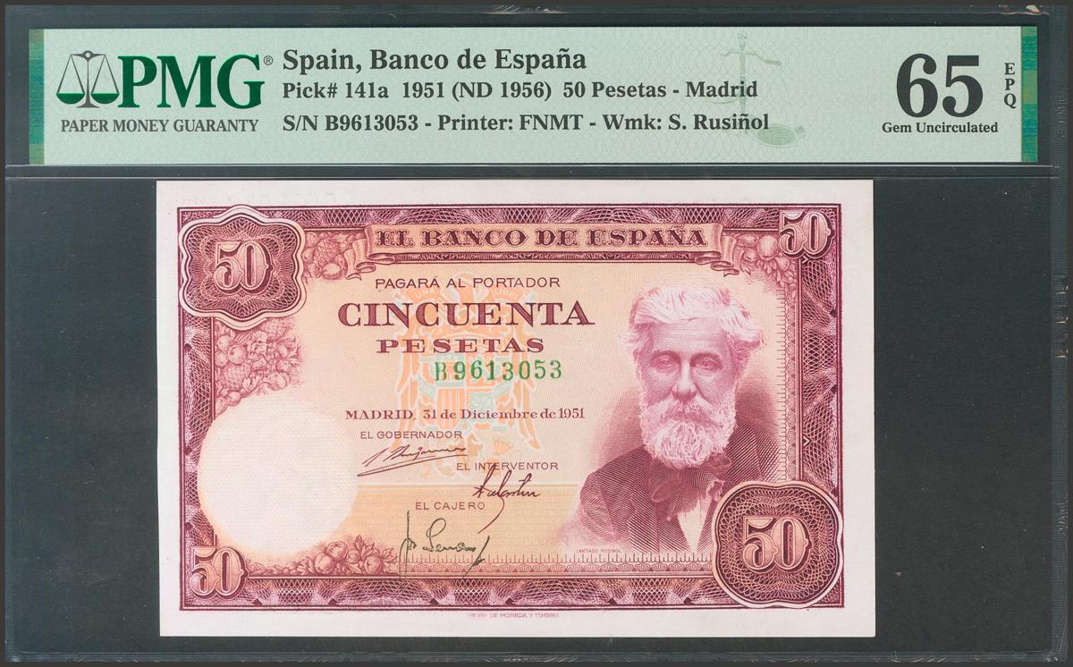 50 Pesetas. 31 de Diciembre de 1951. Serie B. (Edifil 2017: 462a). Inusual así, conserva todo su apresto original. SC. Encapsulado PMG65EPQ.