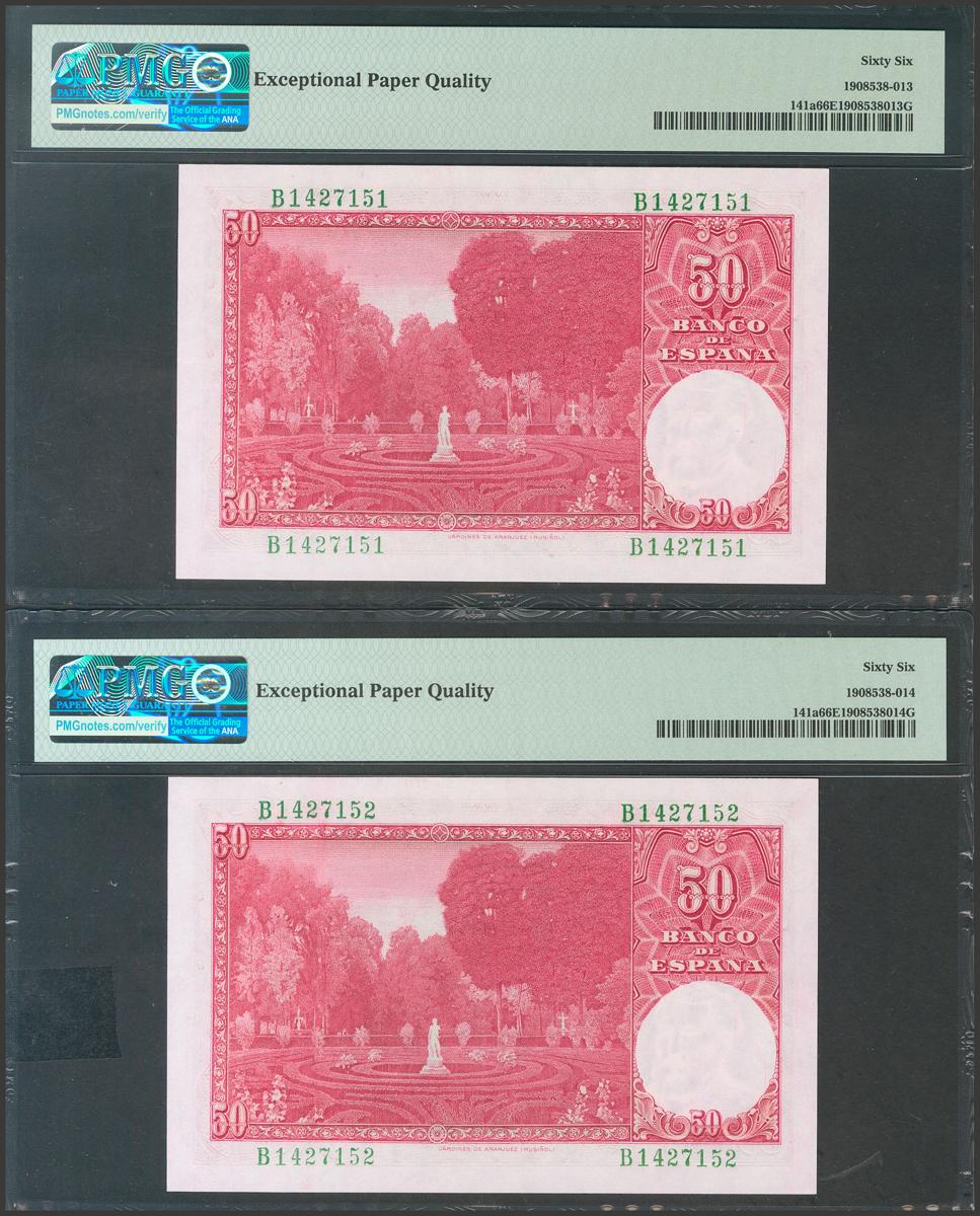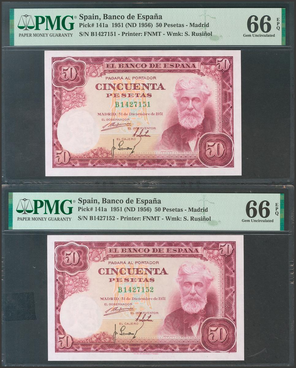 50 Pesetas. 31 de Diciembre de 1951. Pareja correlativa. Serie B. (Edifil 2017: 462a). Conserva todo su apresto original. SC. Encapsulados PMG66EPQ, ambos.