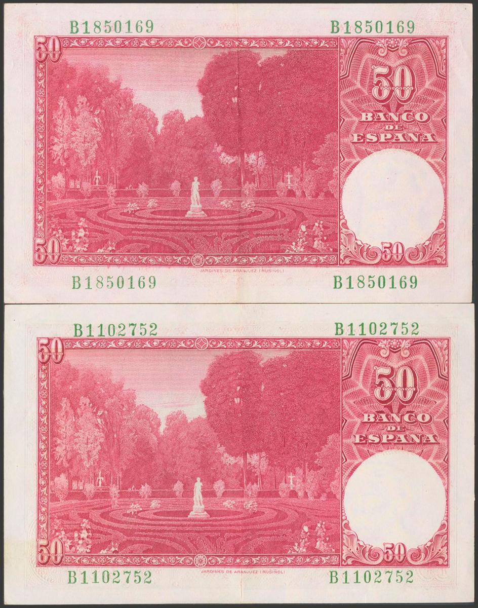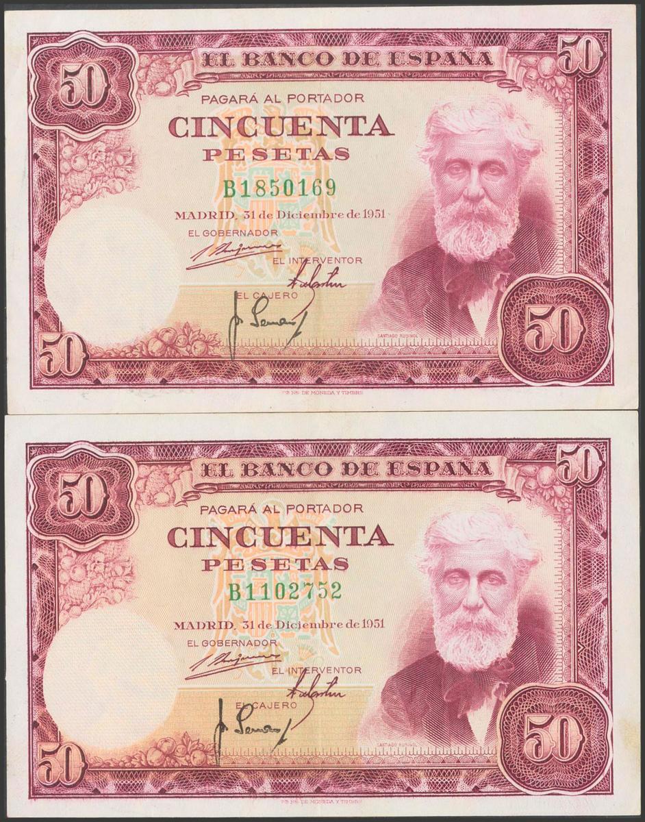 Conjunto de 2 billetes de 50 Pesetas emitidos el 31 de Diciembre de 1951, ambos con serie B (Edifil 2017: 462a), conservan gran parte de su apresto original. EBC.El importe de la liquidación de este lote irá destinado a Manos Unidas.