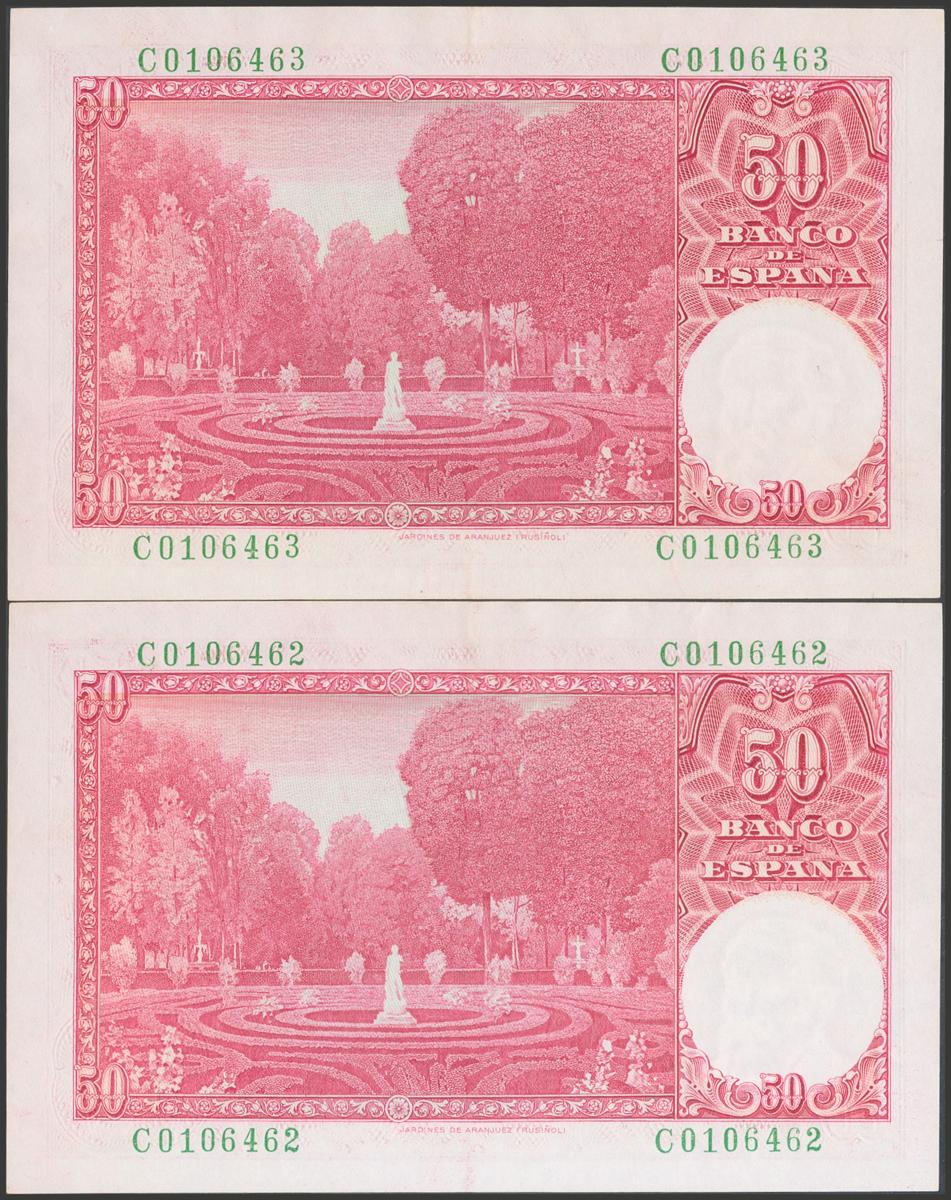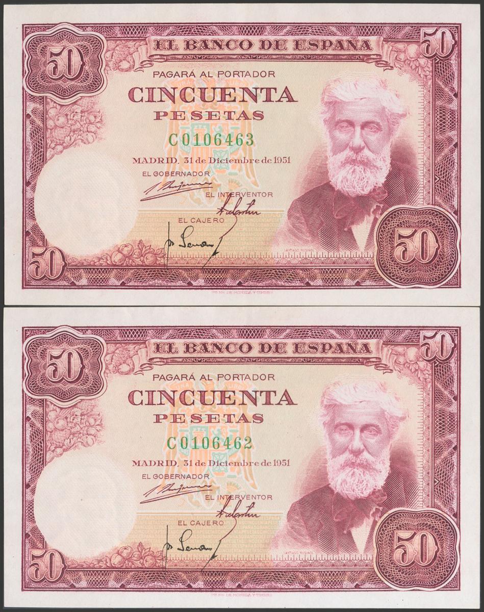 50 Pesetas. 31 de Diciembre de 1951. Pareja correlativa. Serie C. (Edifil 2017: 462a). Conserva la mayor parte del apresto original. EBC+.