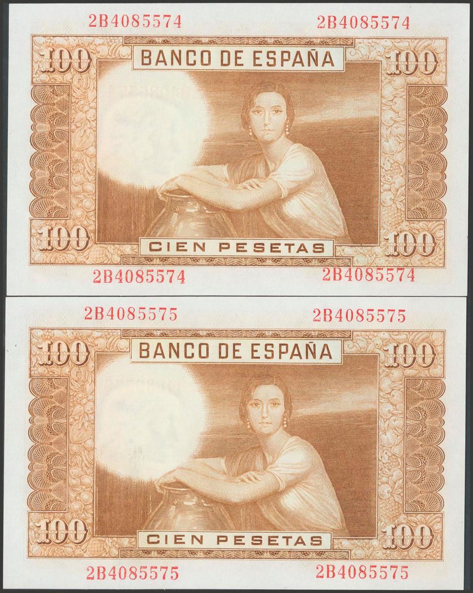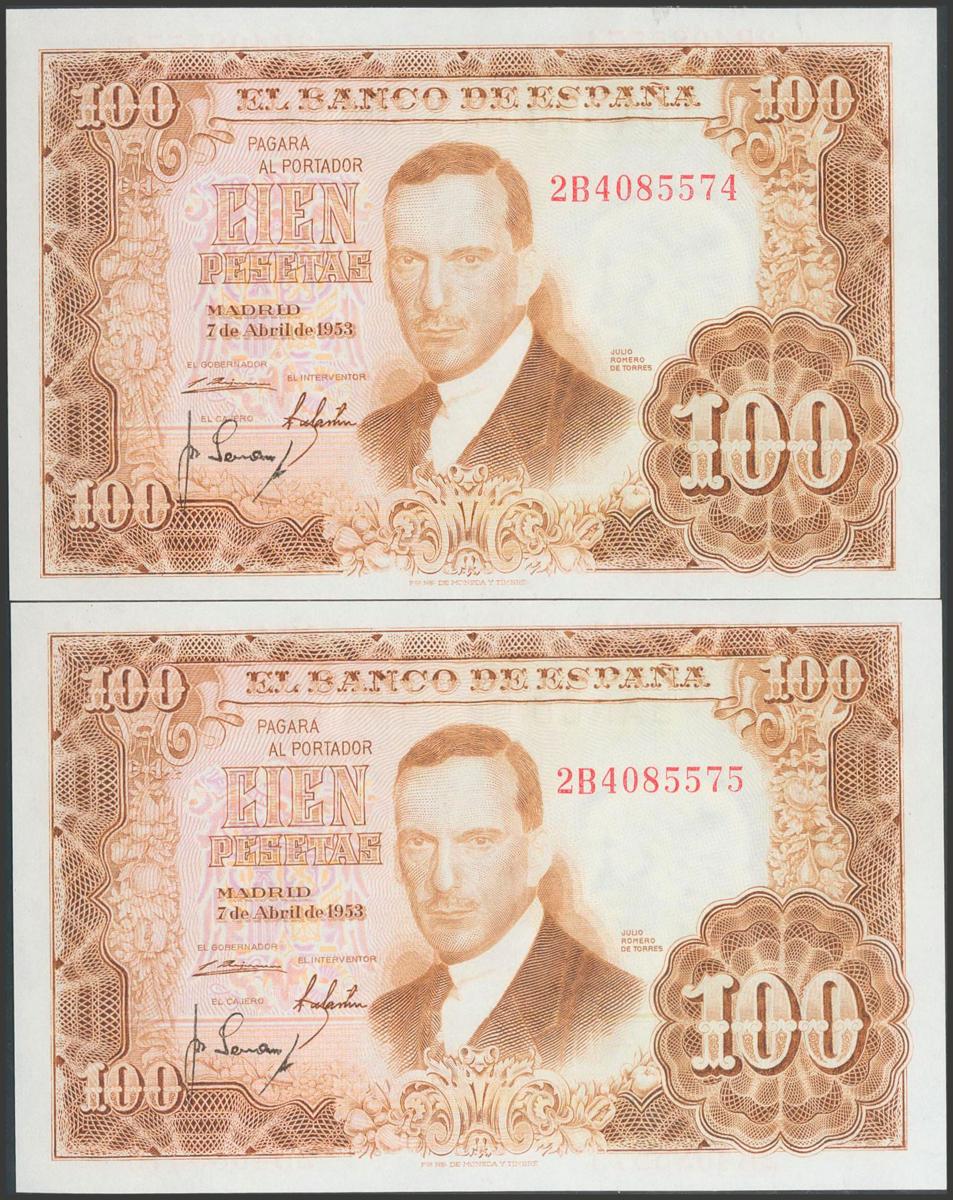 100 Pesetas. 7 de Abril de 1953. Pareja correlativa. Serie 2B. (Edifil 2017: 464c). Apresto original. SC.