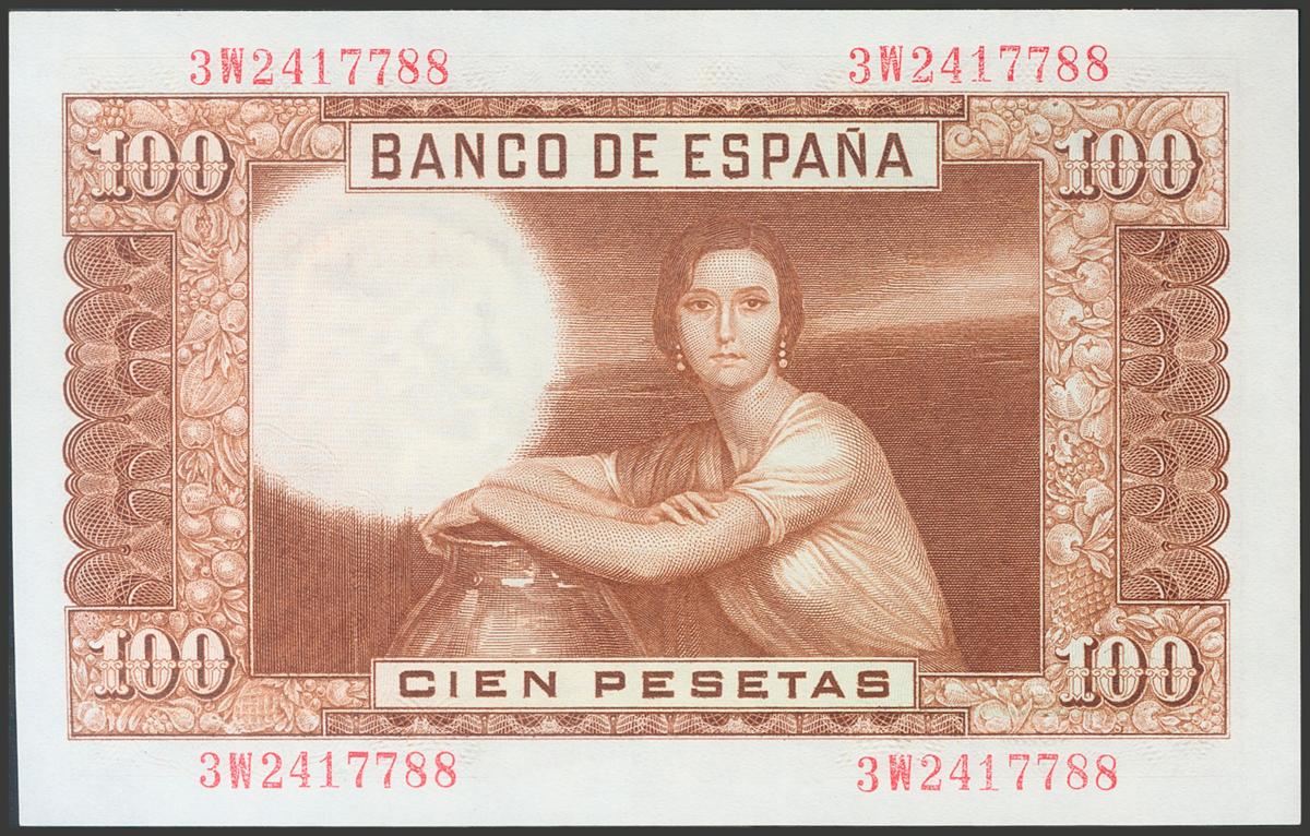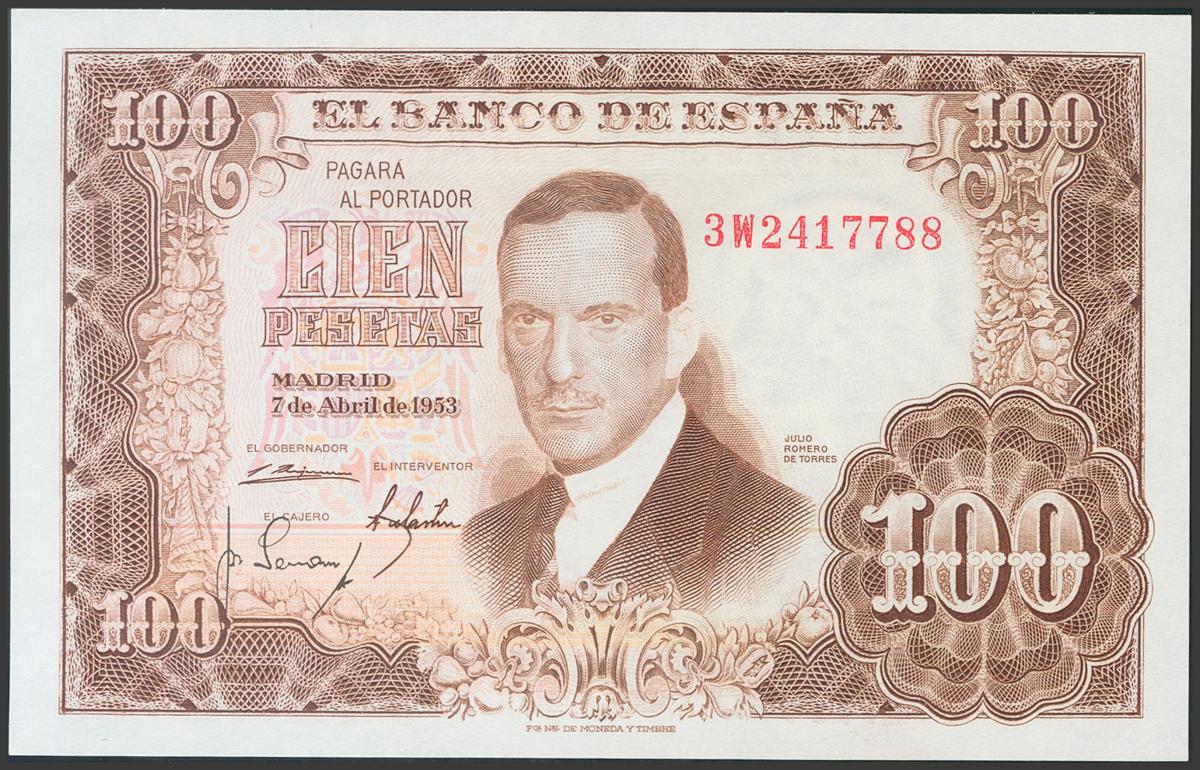 100 Pesetas. 7 de Abril de 1953. Serie 3W. (Edifil 2017: 464c). Apresto original. SC.