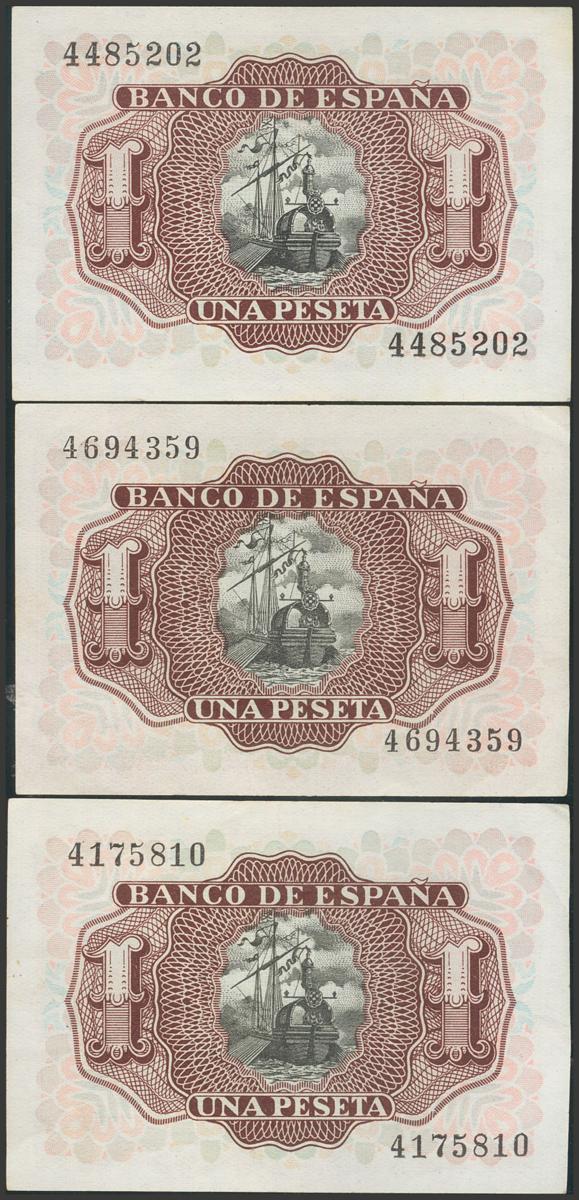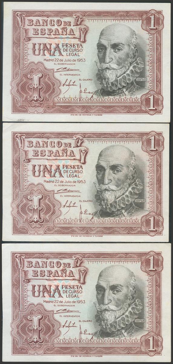 Conjunto de 3 billetes de 1 Peseta, emitidos el 22 de Julio de 1953, todos ellos sin serie. (Edifil 2017: 465). EBC.