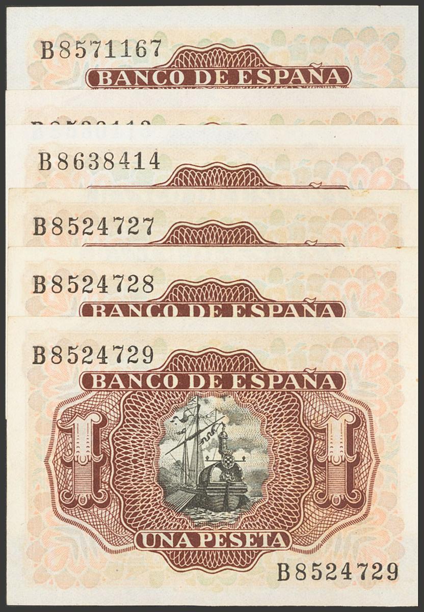 Conjunto de 6 billetes (algunos en tramos correlativos) de 1 Peseta emitidos el el 22 de Julio de 1953 con la serie B (Edifil 2017: 465a), con todo su apresto. SC/SC-.