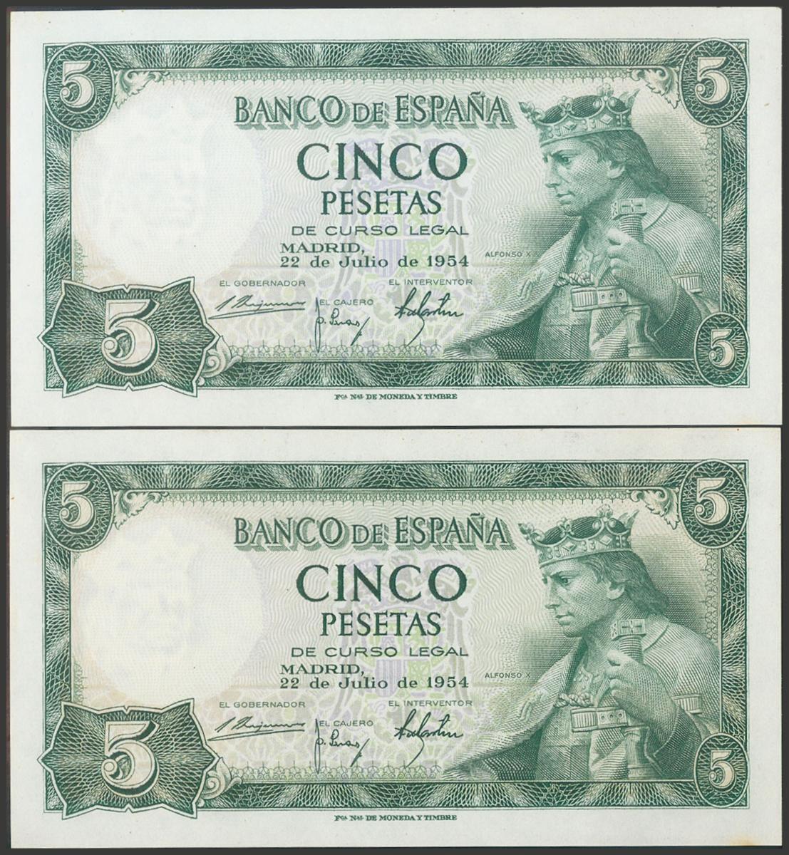 5 Pesetas. 22 de Julio de 1954. Pareja correlativa. Serie E. (Edifil 2017: 466a). SC.