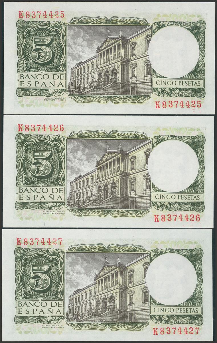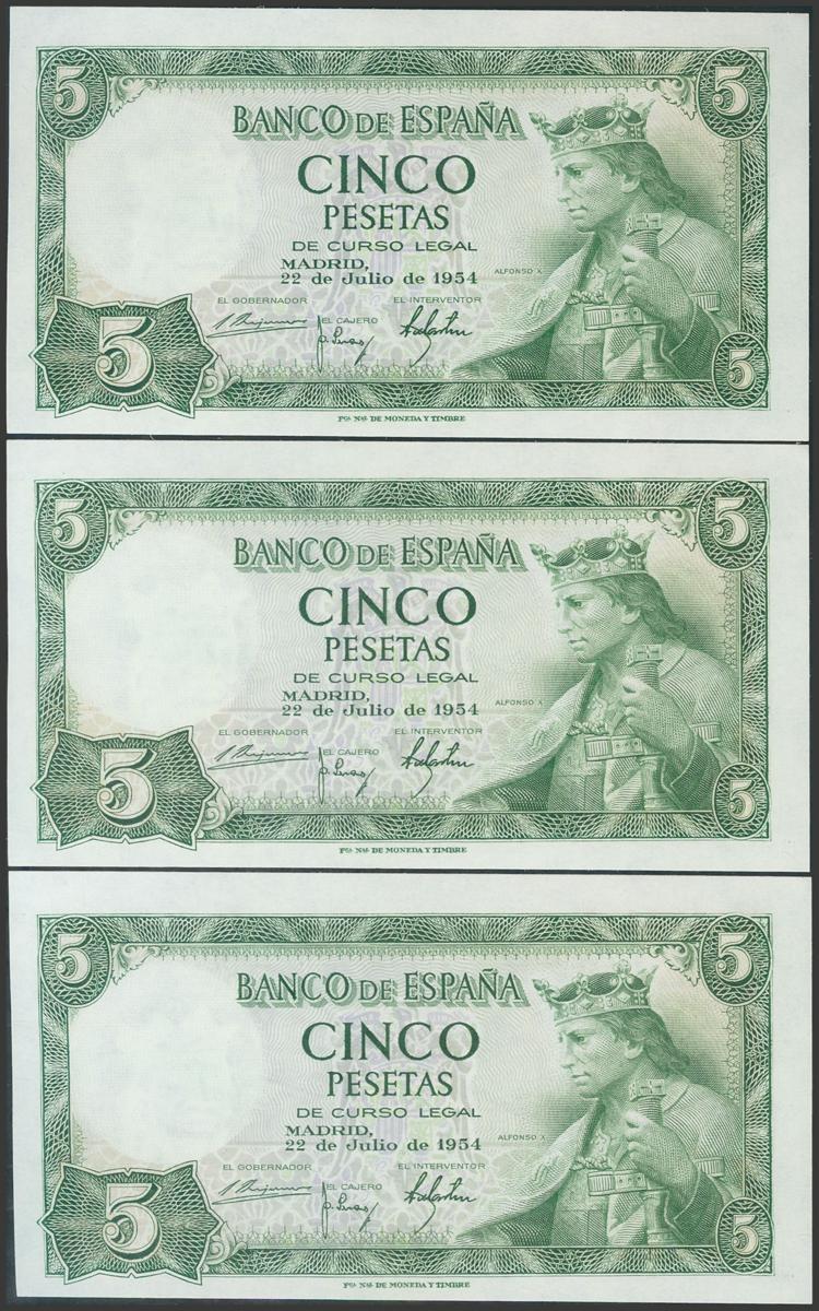 5 Pesetas. 22 de Julio de 1954. Trío correlativo. Serie K. (Edifil 2017: 466a). Apresto original. SC.