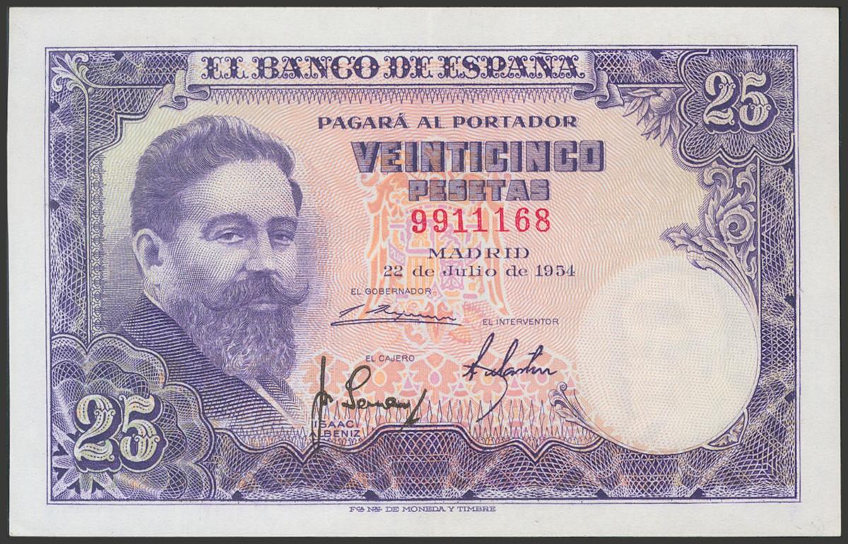 25 Pesetas. 22 de Julio de 1954. Sin serie. (Edifil 2017: 467). Apresto original. EBC.