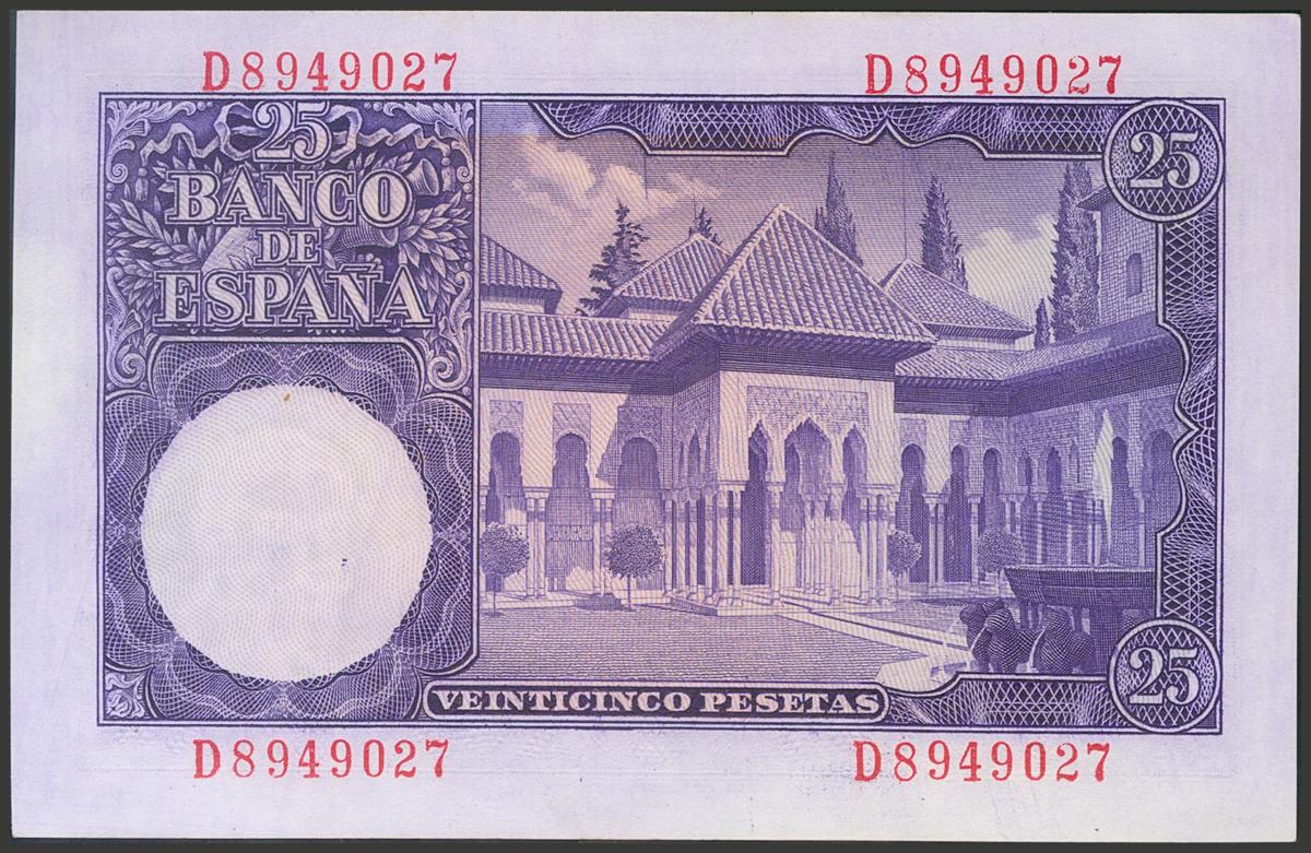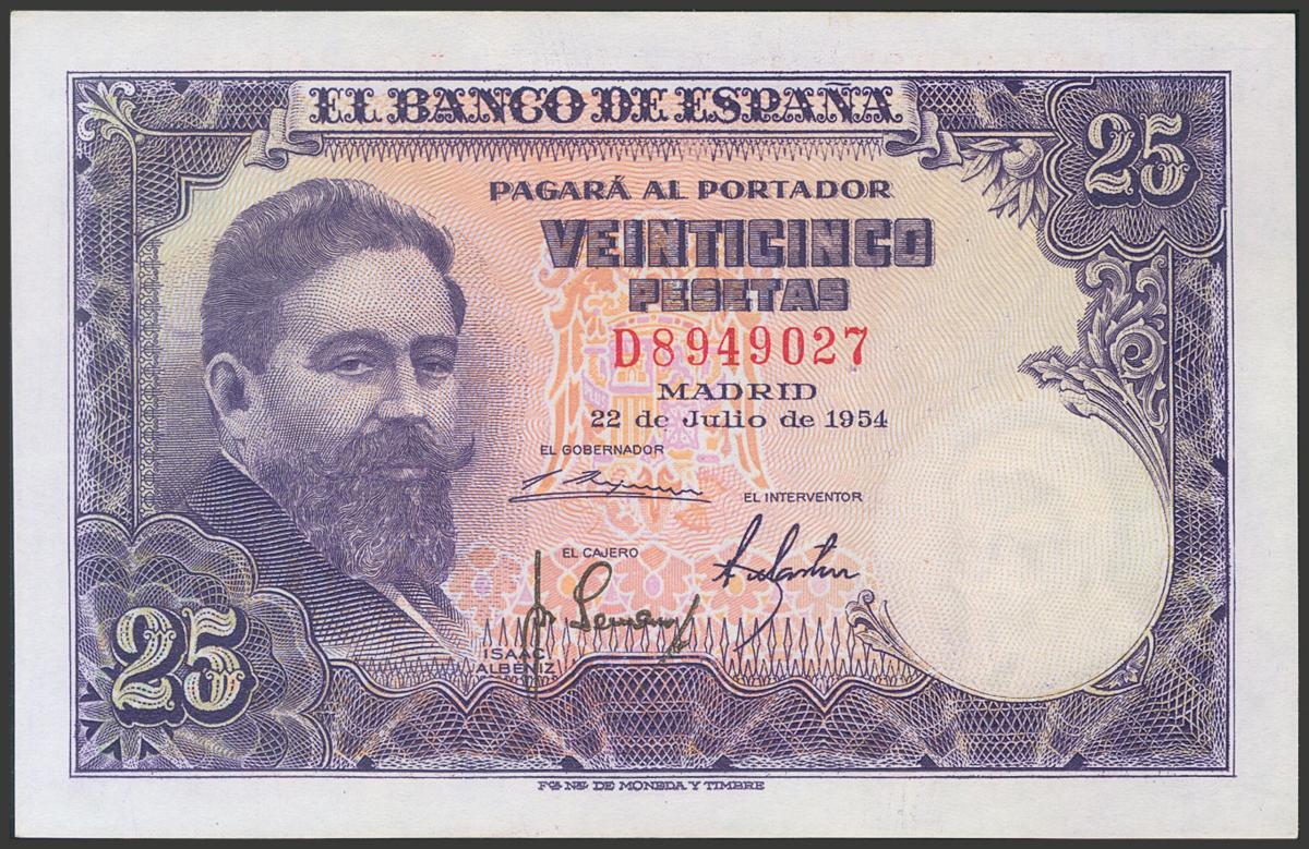25 Pesetas. 22 de Julio de 1954. Serie D. (Edifil 2017: 467a). Apresto original. SC.