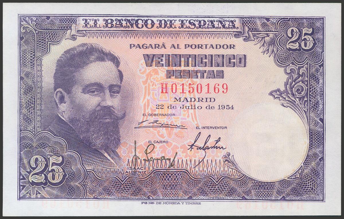 25 Pesetas. 22 de Julio de 1954. Serie H. (Edifil 2017: 467a). Conserva todo su apresto original. EBC+.