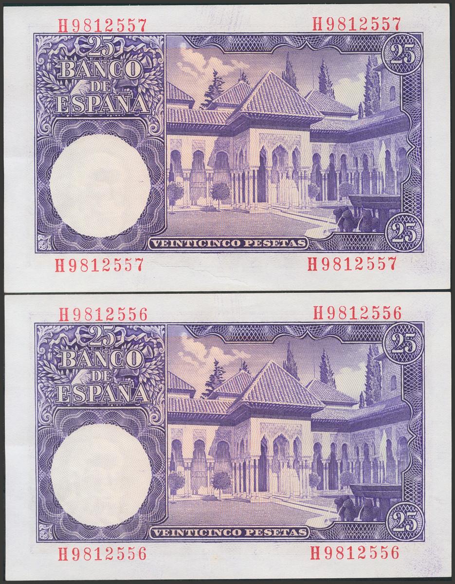 25 Pesetas. 22 de Julio de 1954. Pareja correlativa. Serie H. (Edifil 2017: 467a). Conserva todo su apresto original. SC-.