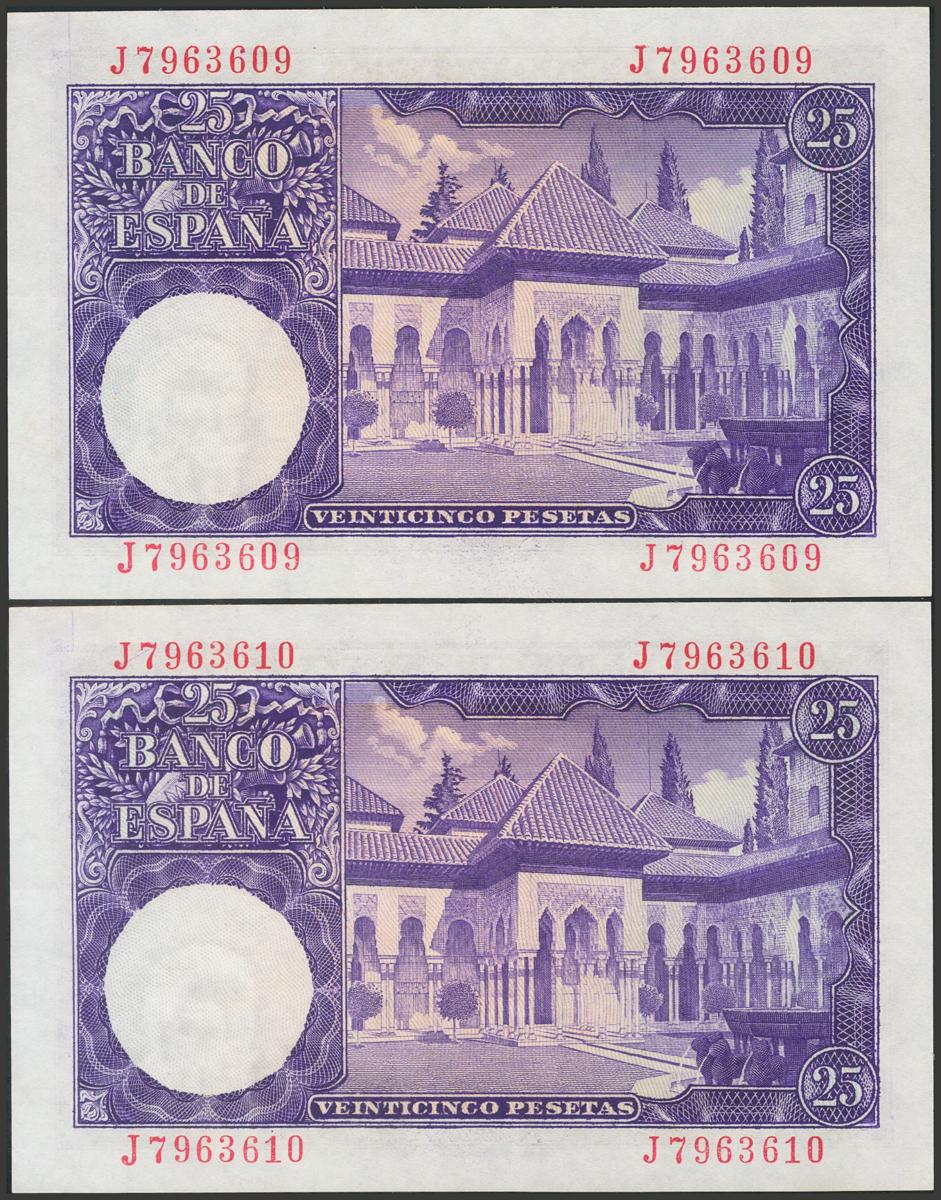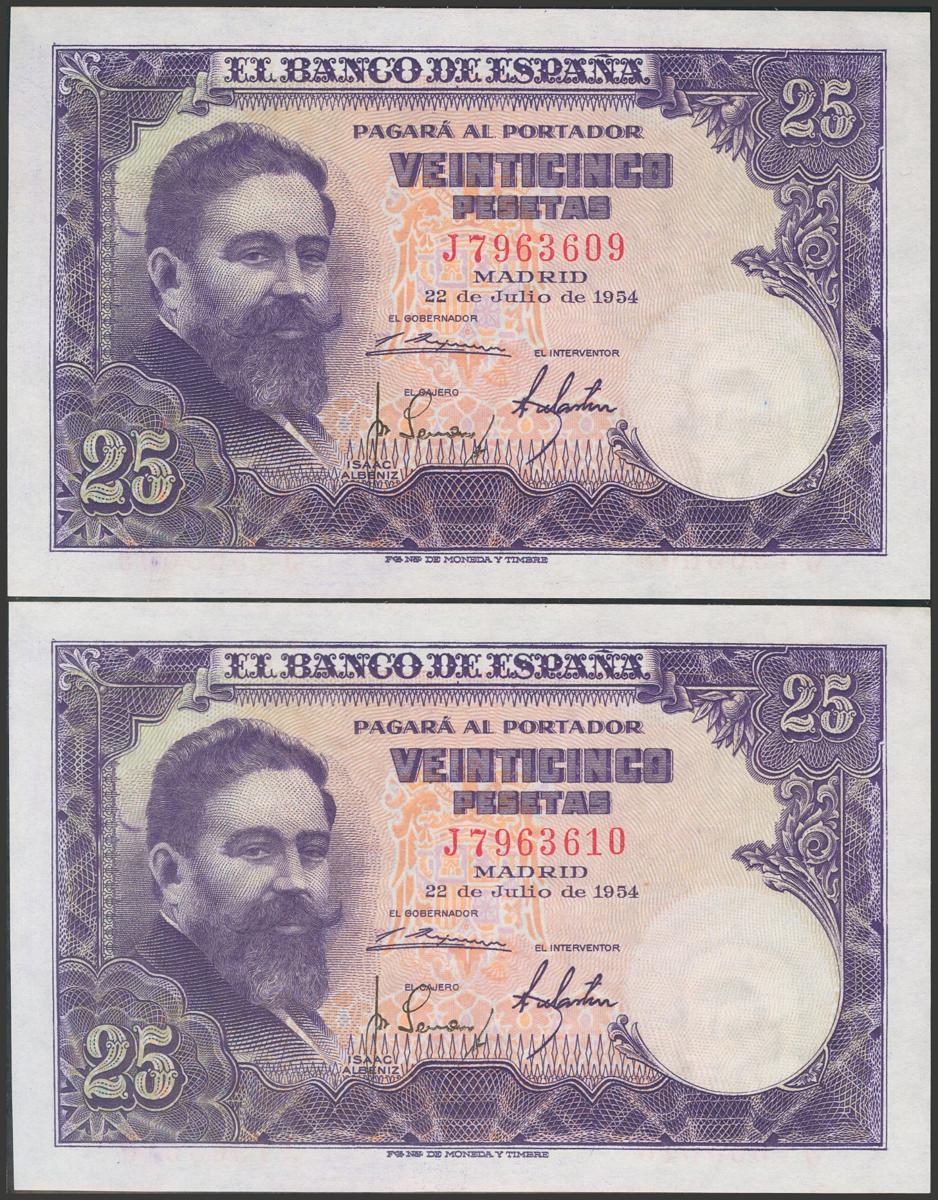 25 Pesetas. 22 de Julio de 1954. Pareja correlativa. Serie J. (Edifil 2017: 467a). Conserva todo su apresto original. SC-.