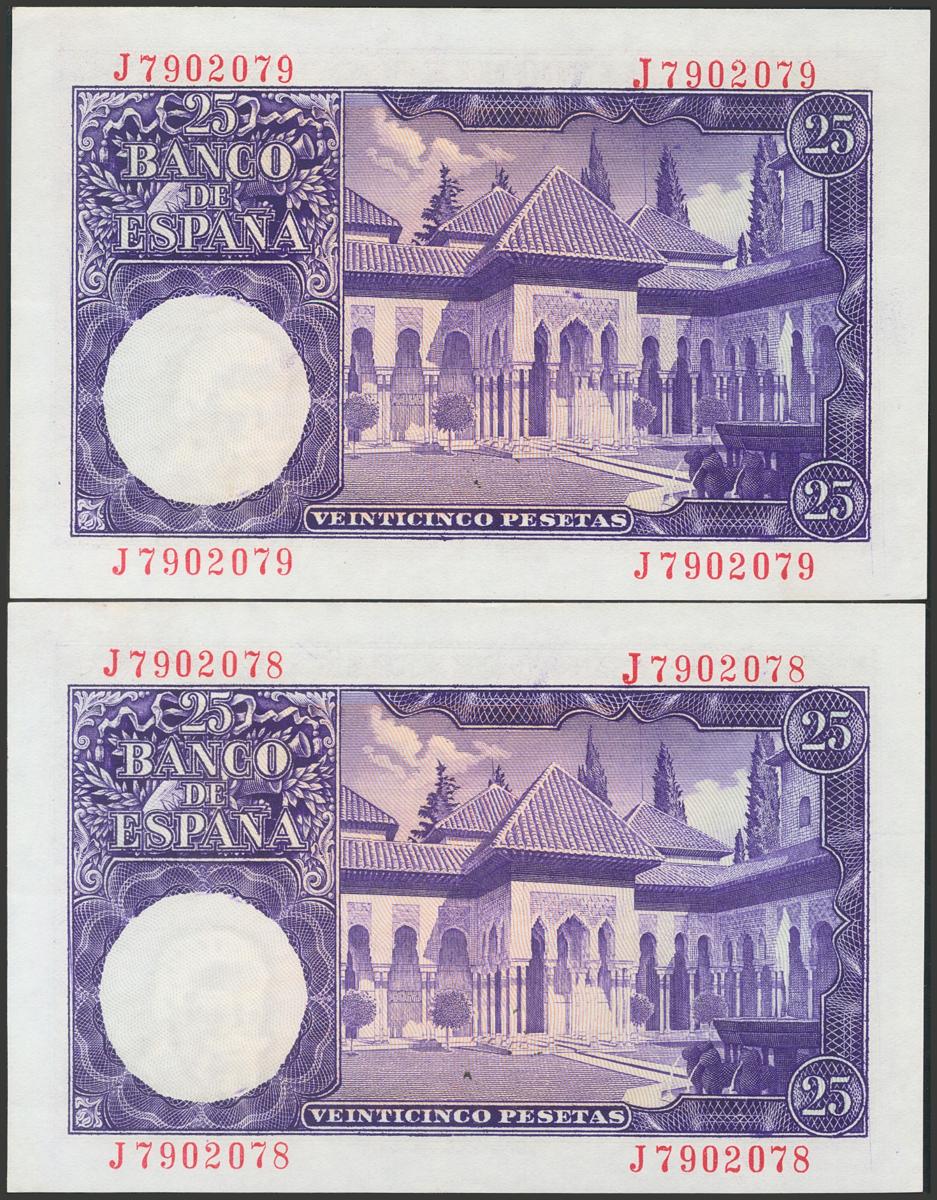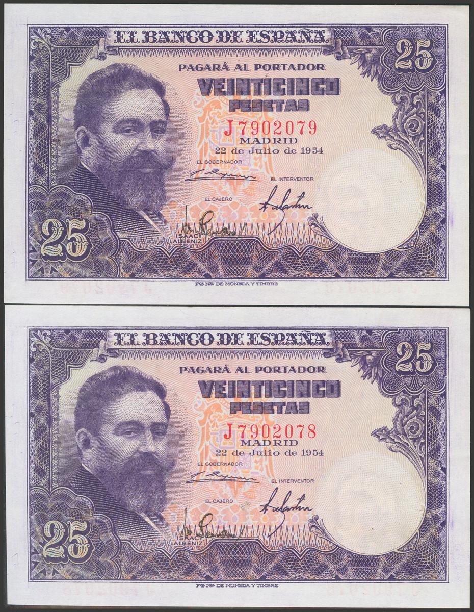 25 Pesetas. 22 de Julio de 1954. Pareja correlativa. Serie J. (Edifil 2017: 467a). Conserva todo su apresto original. EBC+.
