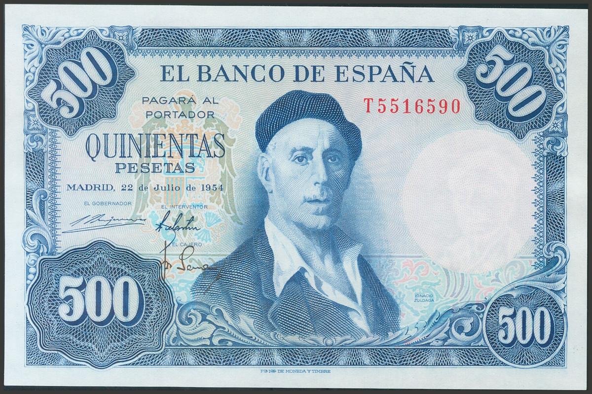 500 Pesetas. 22 de Julio de 1954. Serie T. (Edifil 2017: 468b). Conserva todo su apresto original. SC.