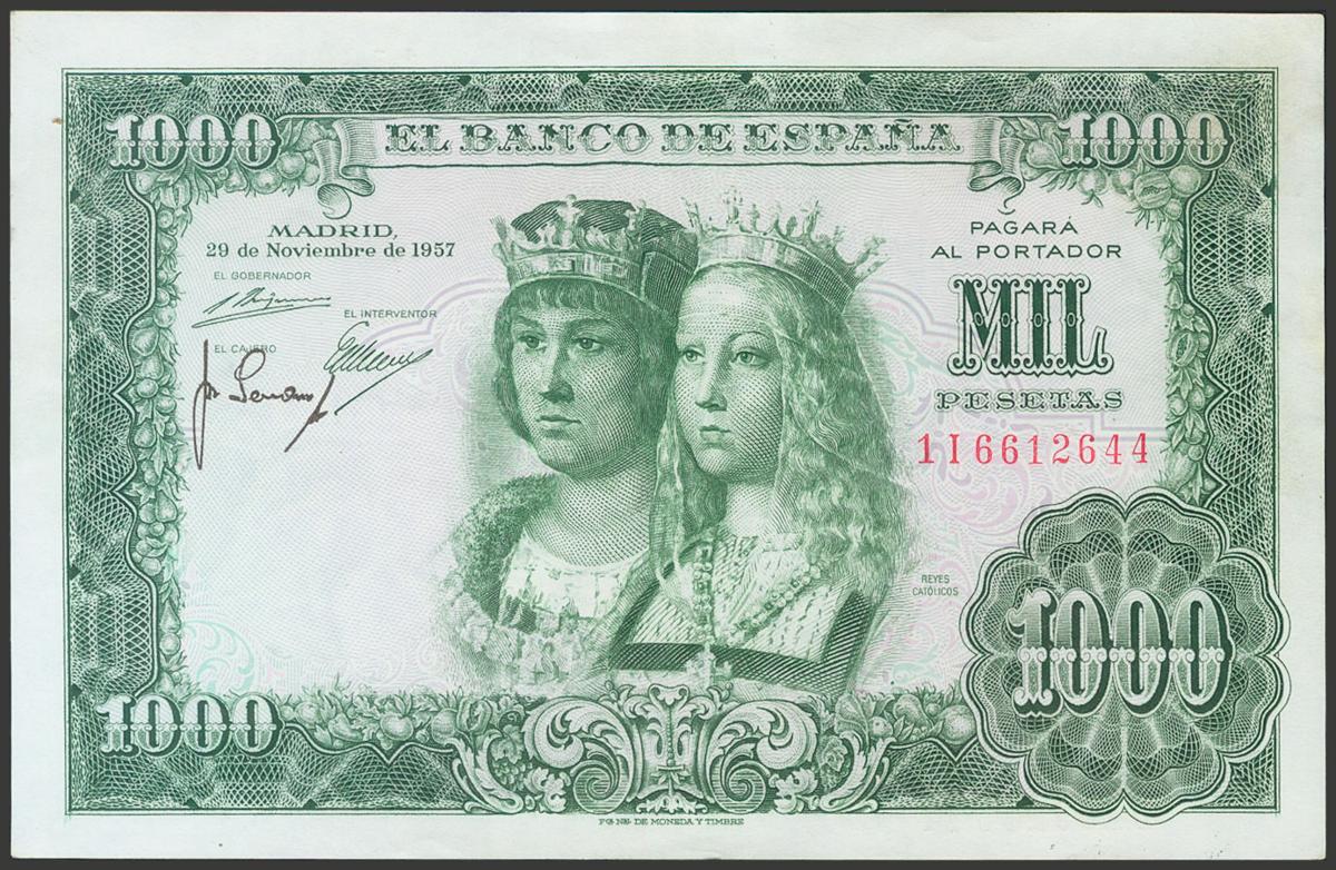 1000 Pesetas. 29 de Noviembre de 1957. Serie 1I. (Edifil 2017: 469b). Conserva parte de su apresto original. EBC-.