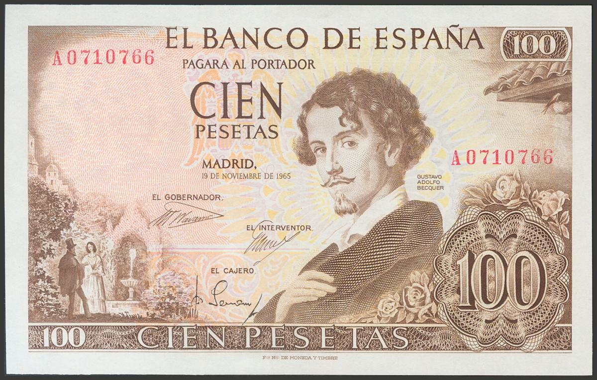 100 Pesetas. 19 de Noviembre de 1965. Serie A. (Edifil 2017: 470a). Apresto original. SC.