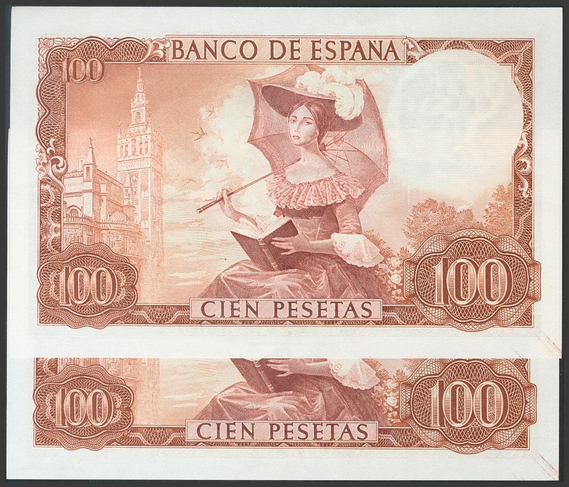 100 Pesetas. 19 de Noviembre de 1965. Pareja correlativa. Serie A. (Edifil 2017: 470a). SC-.