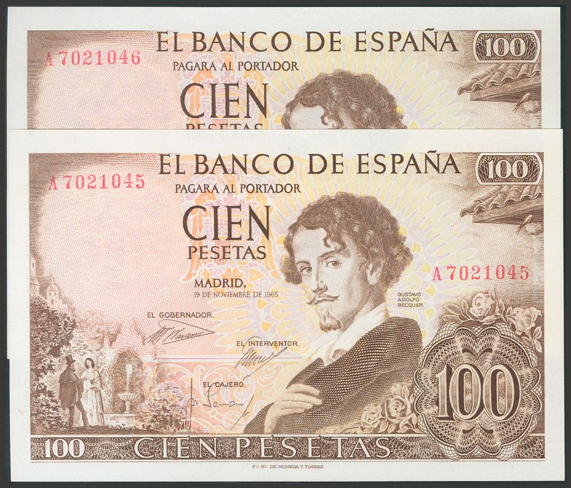 100 Pesetas. 19 de Noviembre de 1965. Pareja correlativa. Serie A. (Edifil 2017: 470a). SC-.