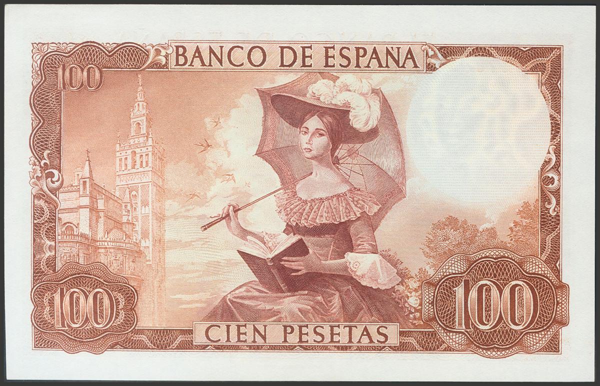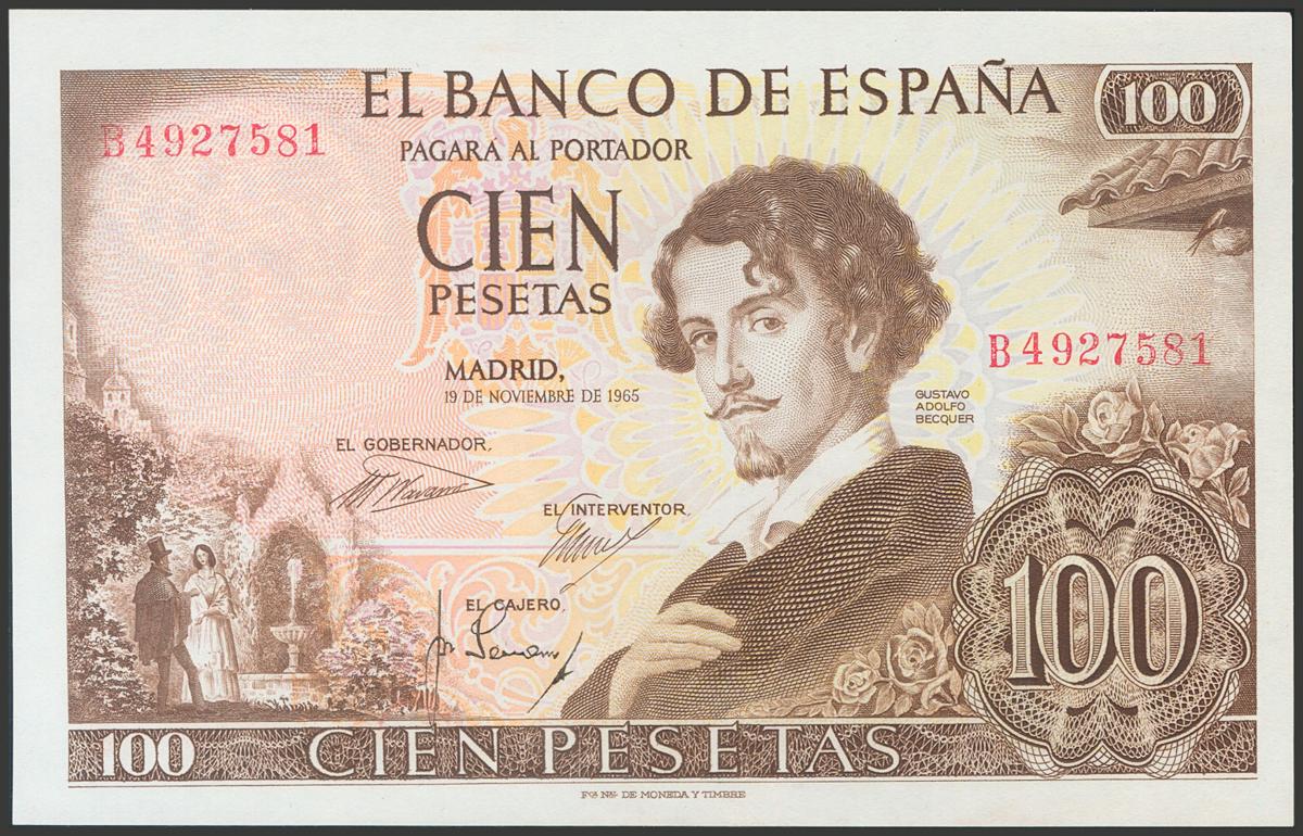 100 Pesetas. 19 de Noviembre de 1965. Serie B. (Edifil 2017: 470a). Apresto original. SC.